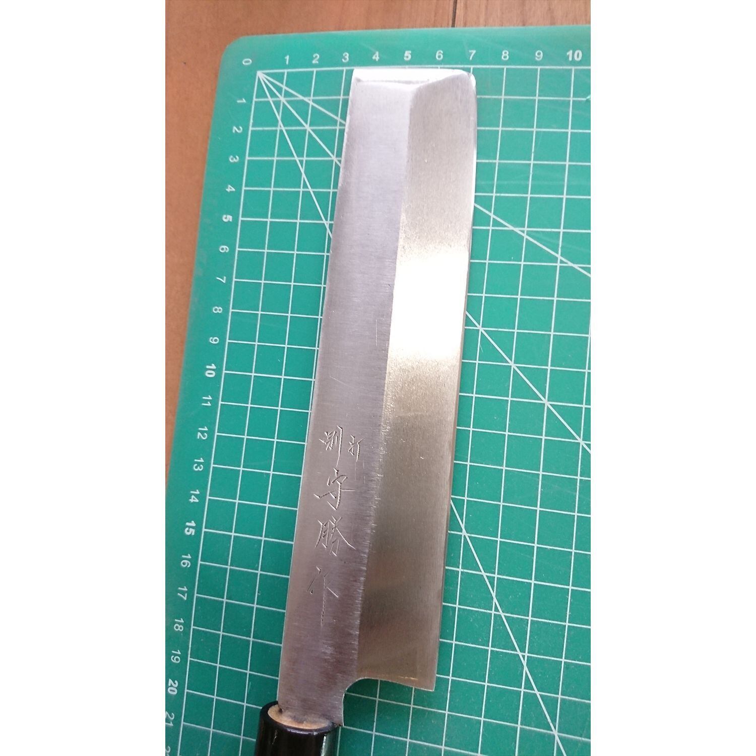 1. o2016/銘:守勝/薄刃包丁(片刃 右利き用)/刃長:180/峰厚 アゴ上:3.4/重量:164/作り:別打(白鋼?)/他:柄は当社にて新品と交換済み