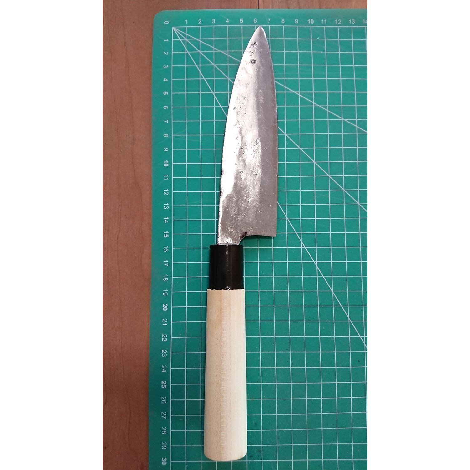 1. o2017/銘:松原周/三徳包丁(両刃 右利き・左利き兼用)/刃長:155/峰厚 アゴ上:3.9/重量:110/作り:鋼 元 黒打/他:柄は当社にて新品と交換済み
