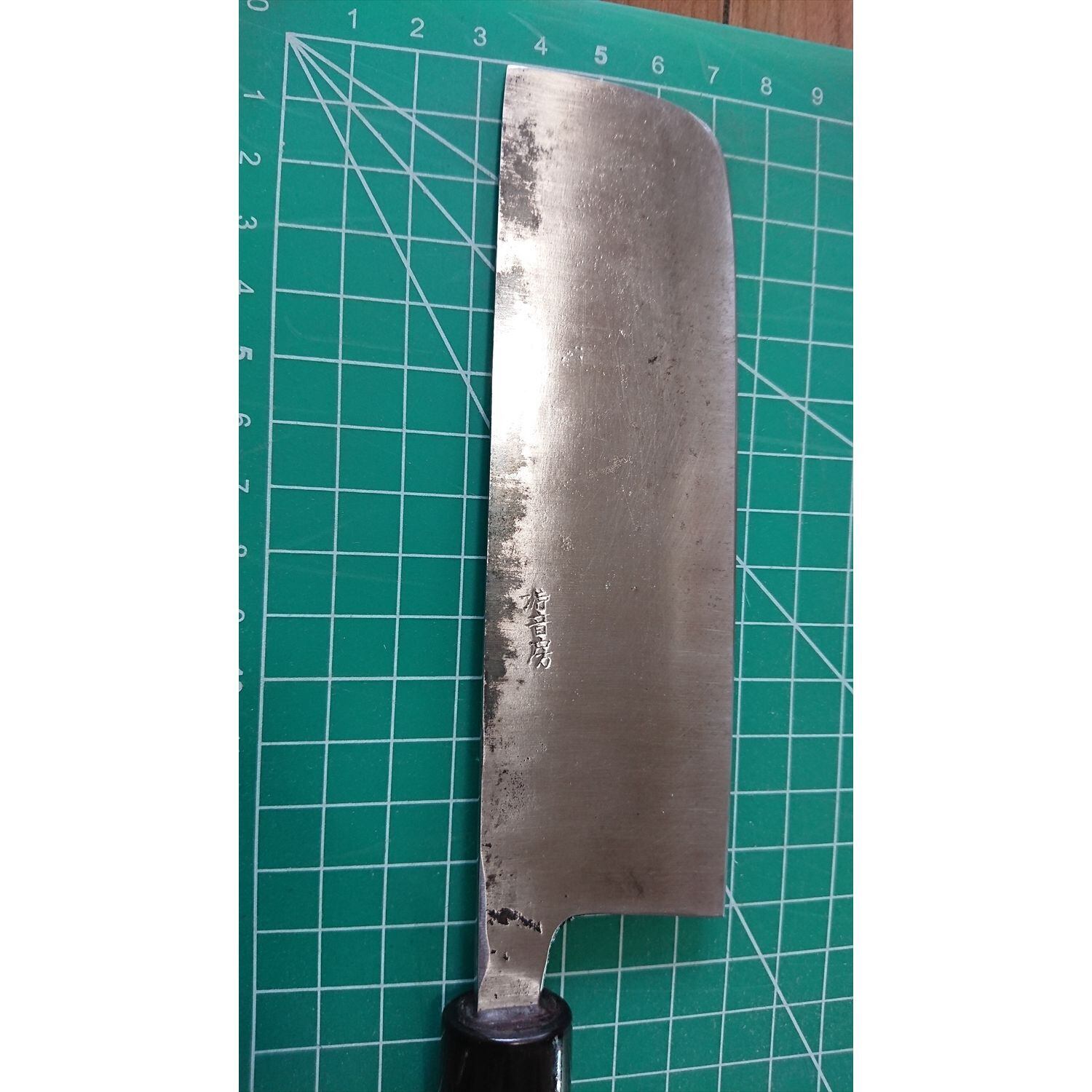 1. o2004/銘:?音房/菜切包丁(両刃 右利き・左利き兼用)/刃長:135/峰厚 アゴ上:3.1/重量:83/作り:鋼 黒打ち/他: