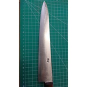 1. o2039/銘:大富/牛刀(両刃 右利き・左利き兼用)/刃長:240/峰厚 アゴ上:1.9/重量:142/作り:鋼 最上/他:柄に浮きがあったので、当社にて取り外して補修済み。刀身が左に曲がっているようだが、解消せず