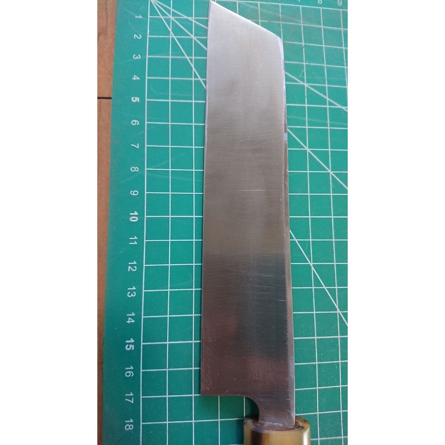 1. o1975/銘:竹晃/薄刃包丁(片刃 右利き用)/刃長:170/峰厚 アゴ上:2.7/重量:115/作り:別打(白鋼?) 水牛柄/他: