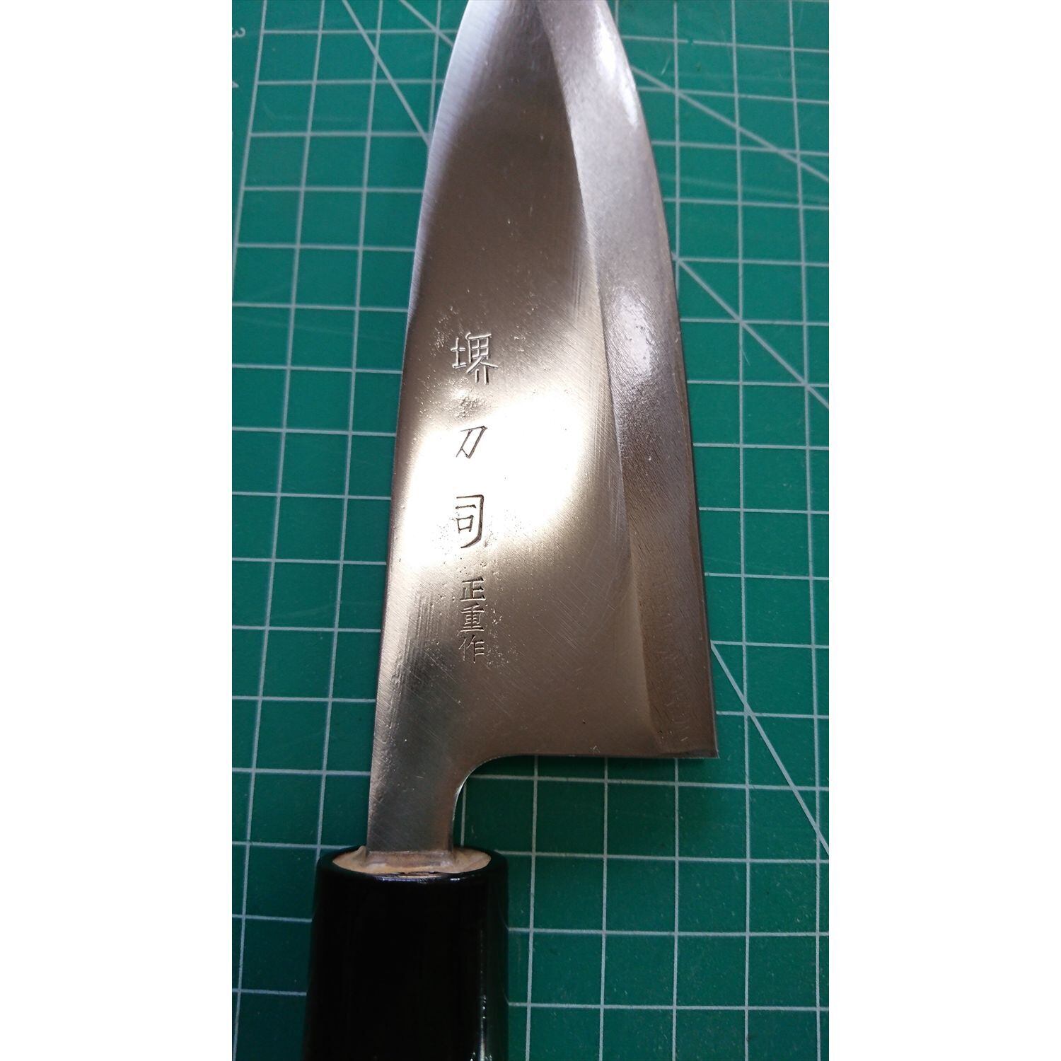 中古o2028 切れる出刃包丁 堺刀司 正重作 刃145mm+2特典