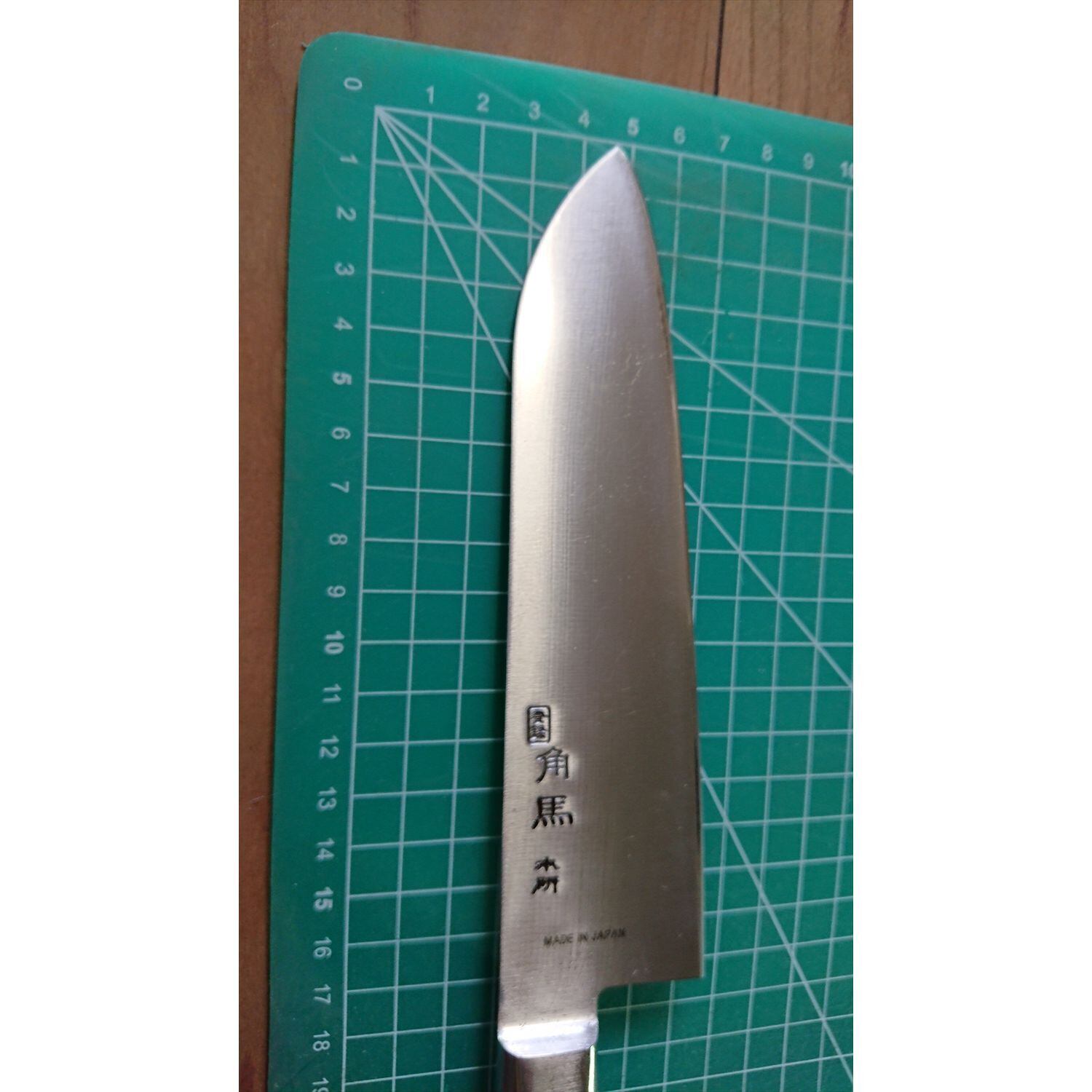 1. o2074/銘:角馬/三徳包丁(両刃 右利き・左利き兼用)/刃長:170/峰厚 アゴ上:1.6/重量:150/作り:ステンレス?/他:柄は乾くと白っぽくなる