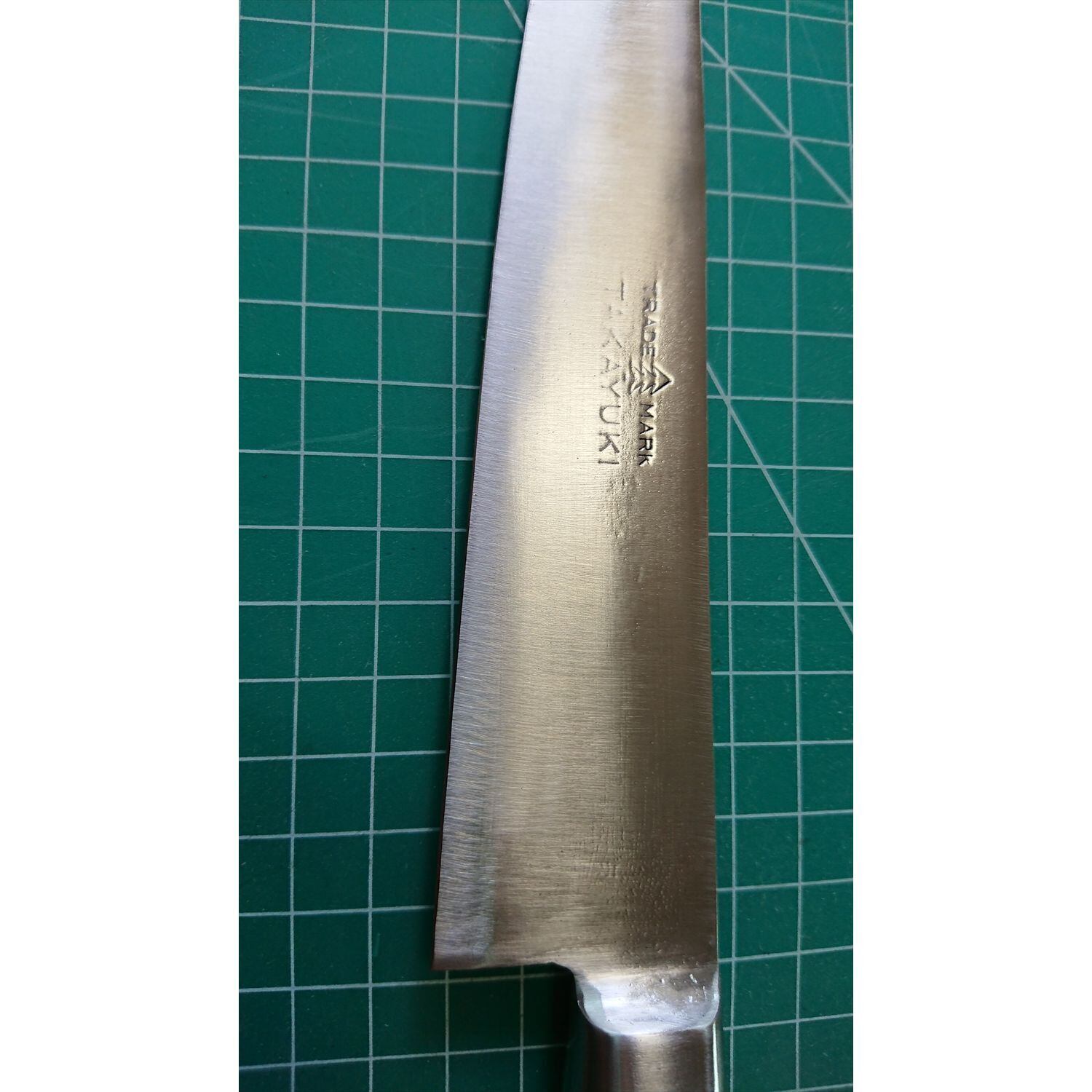 1. o2069/銘:堺孝行/牛刀(両刃 右利き・左利き兼用)/刃長:195/峰厚 アゴ上:1.7/重量:148/作り:鋼 別上/他: