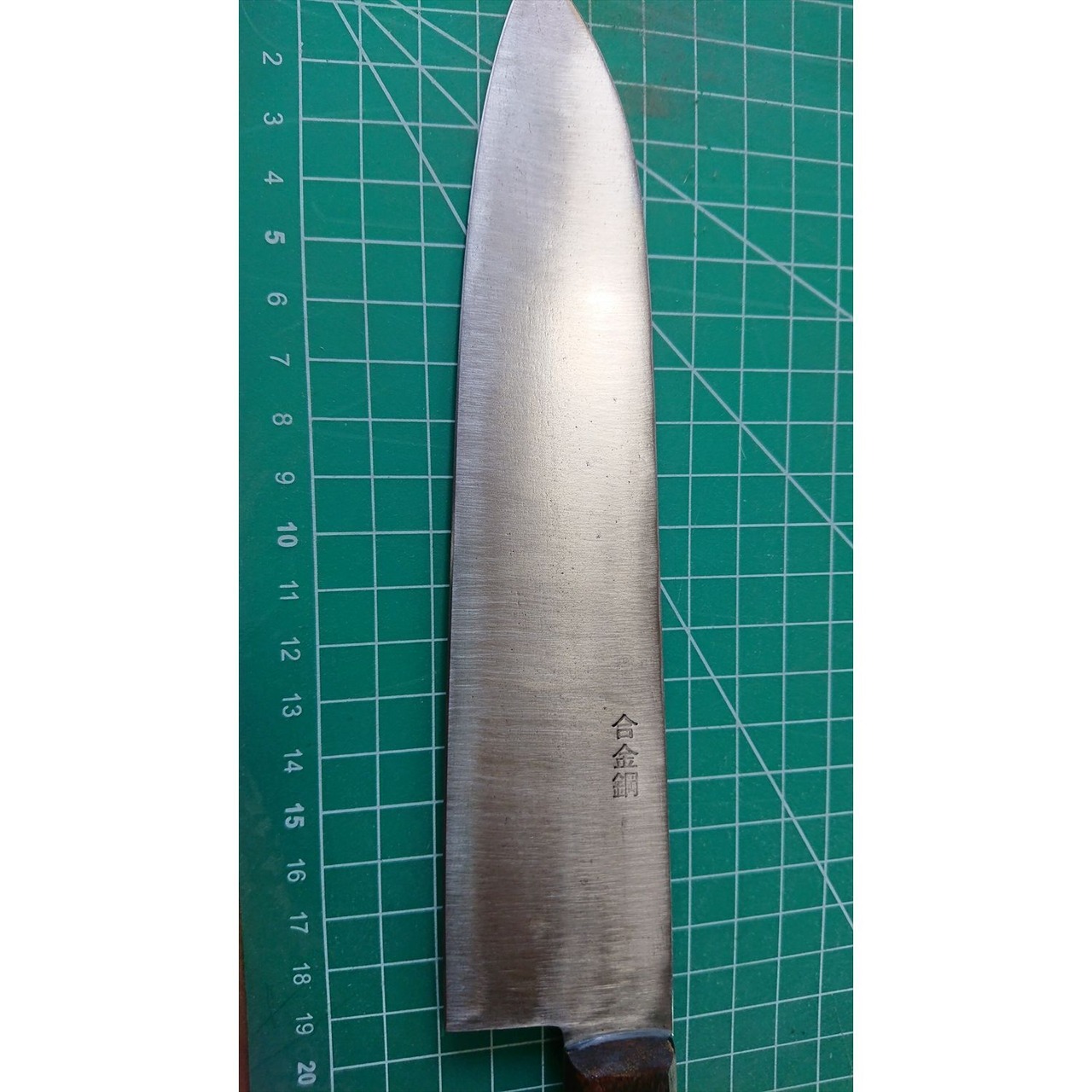 1. o2093/銘:有次/牛刀(両刃 右利き・左利き兼用)/刃長:190/峰厚 アゴ上:2.2/重量:139/作り:別打 合金鋼/他:柄に浮きがあったので、当社にて取り外して補修済み