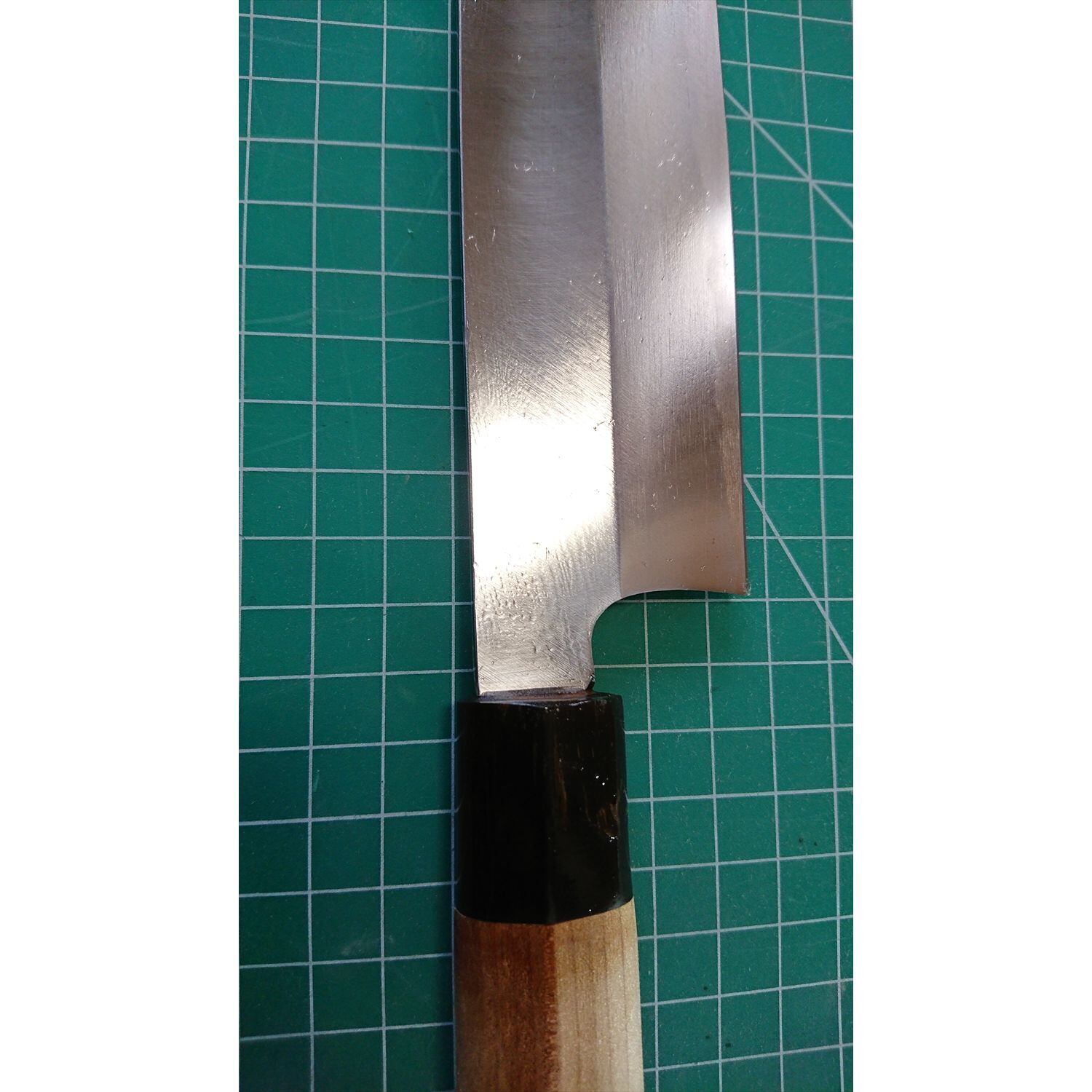 1. o2195/銘:堺一文字光秀/鎌形薄刃包丁(片刃 右利き用)/刃長:170/峰厚 アゴ上:3.7/重量:161/作り:鋼 水牛柄/他:柄に一部欠けがあったが当社にて補修済み