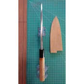 1. o2197/銘:貞宗/出刃包丁(片刃 左利き用)/刃長:165/峰厚 アゴ上:8.1/重量:288/作り:鋼 水牛柄/他:柄に一部欠けがあったが当社にて補修済み。木製サヤ付き
