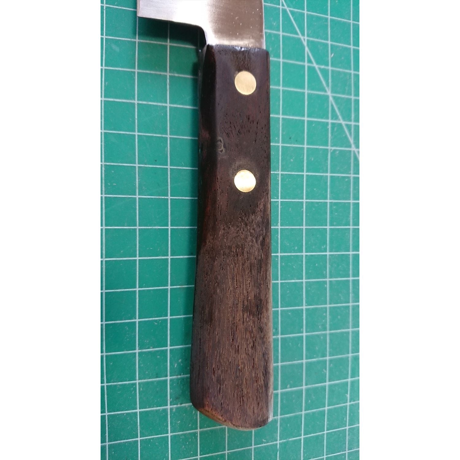 1. o2164/銘:本家芳忠/三徳包丁(両刃 右利き・左利き兼用)/刃長:180/峰厚 アゴ上:2.4/重量:126/作り:純正鋼/他:柄に浮きがあったので、当社にて取り外して補修済み