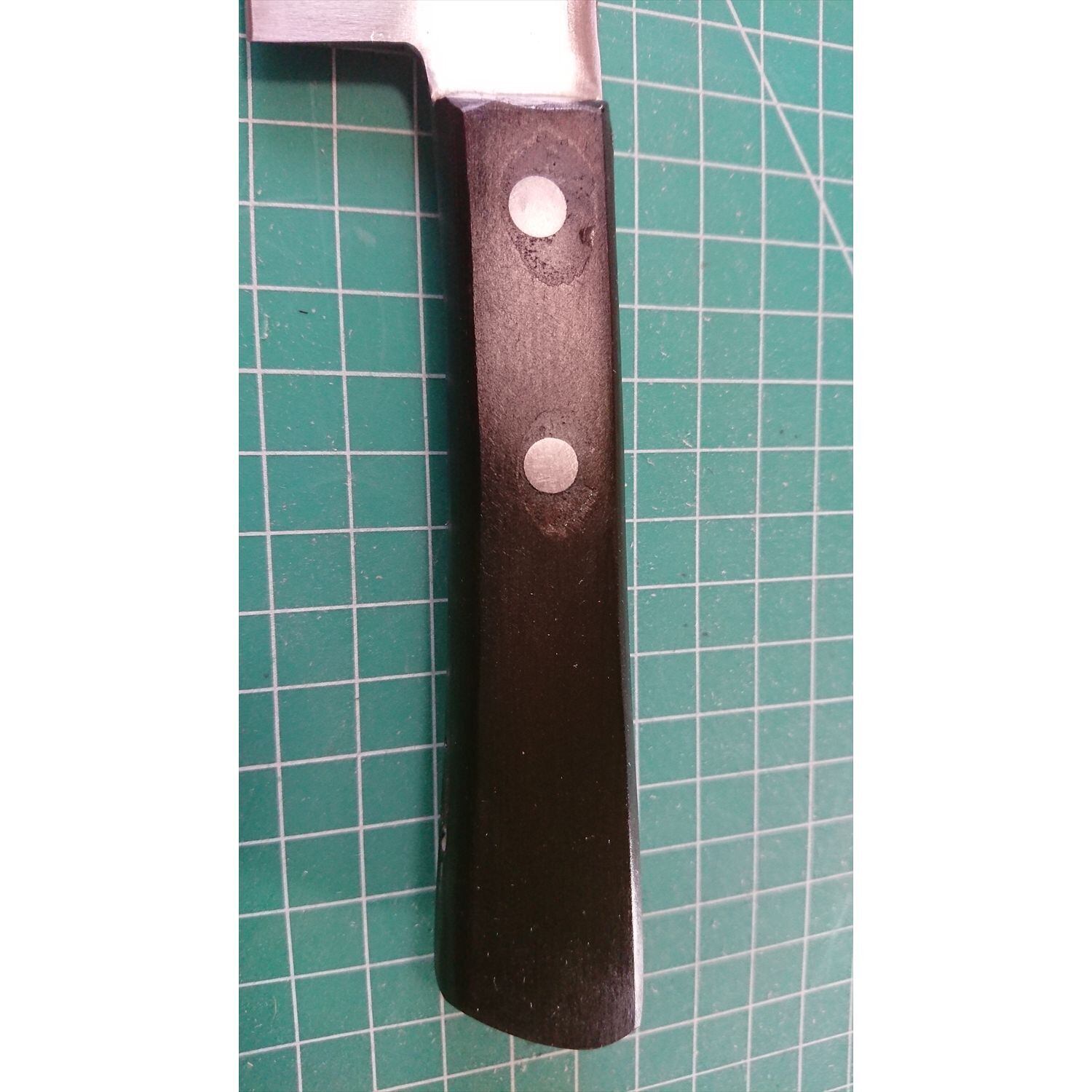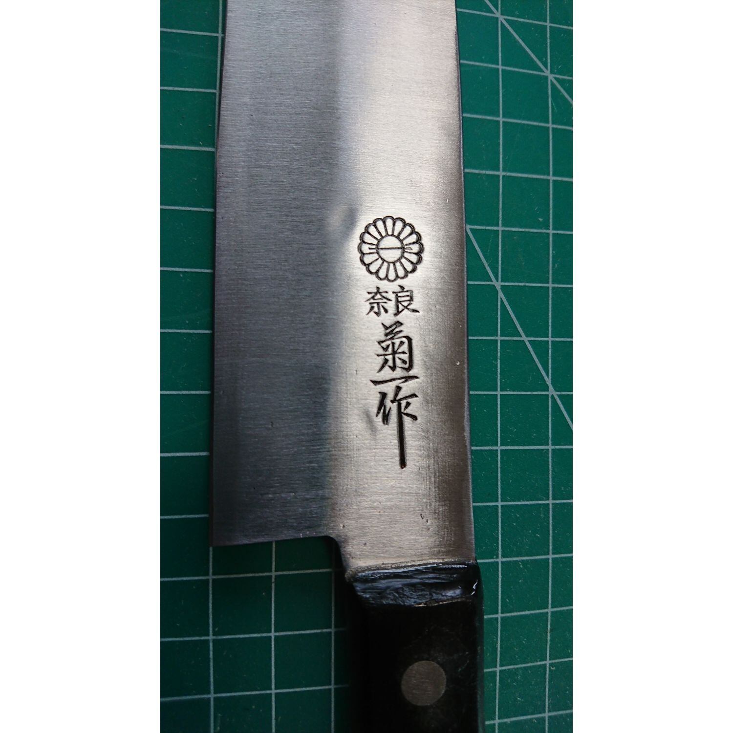 1. o2166/銘:奈良菊一/三徳包丁(両刃 右利き・左利き兼用)/刃長:165/峰厚 アゴ上:1.4/重量:134/作り:鋼/他:柄に浮きがあったので、当社にて取り外して補修済み