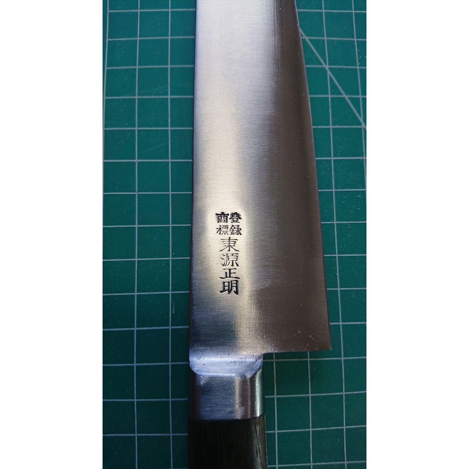 1. o2314/銘:東源正明/牛刀(両刃 右利き・左利き兼用)/刃長:205/峰厚 アゴ上:1.6/重量:137/作り:鋼/他: