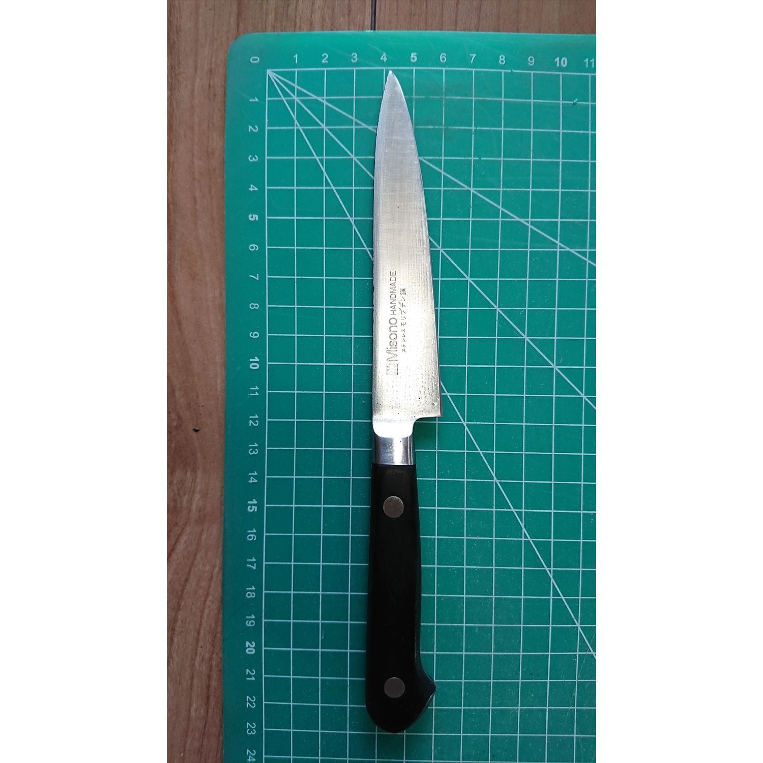 1. o2336/銘:Misono(ミソノ)/ペティナイフ(両刃 右利き・左利き兼用)/刃長:120/峰厚 アゴ上:1.7/重量:64/作り:HANDMADE ステンレスモリブデン鋼/他: