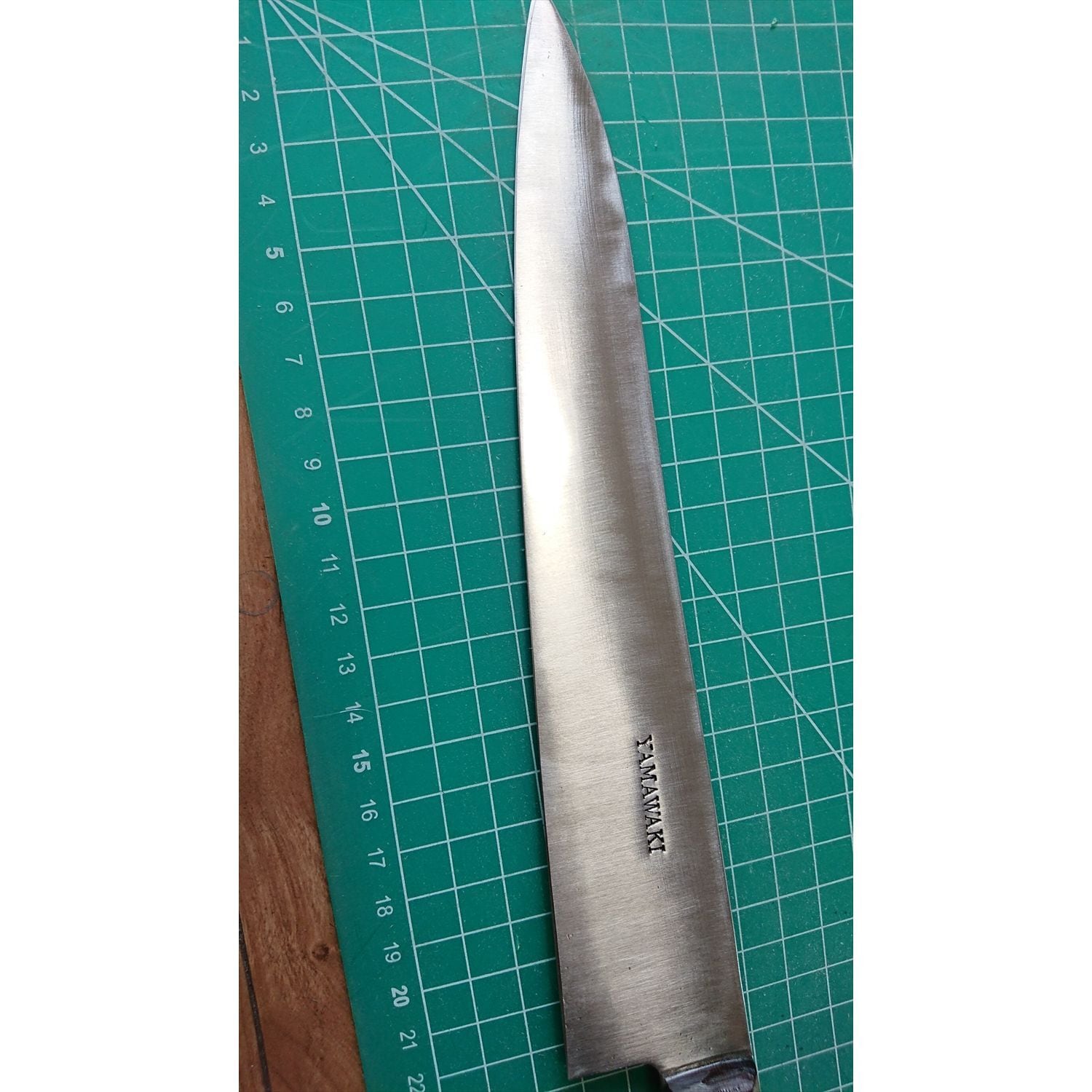 1. o2305/状態:中古/銘:東京村定/牛刀(両刃 左5:右5 右利き・左利き兼用)/刃長:225/峰厚 アゴ上:1.8/重量:121/作り:鋼/他:柄はオーバーホール済み(リベットは新品交換済み)。