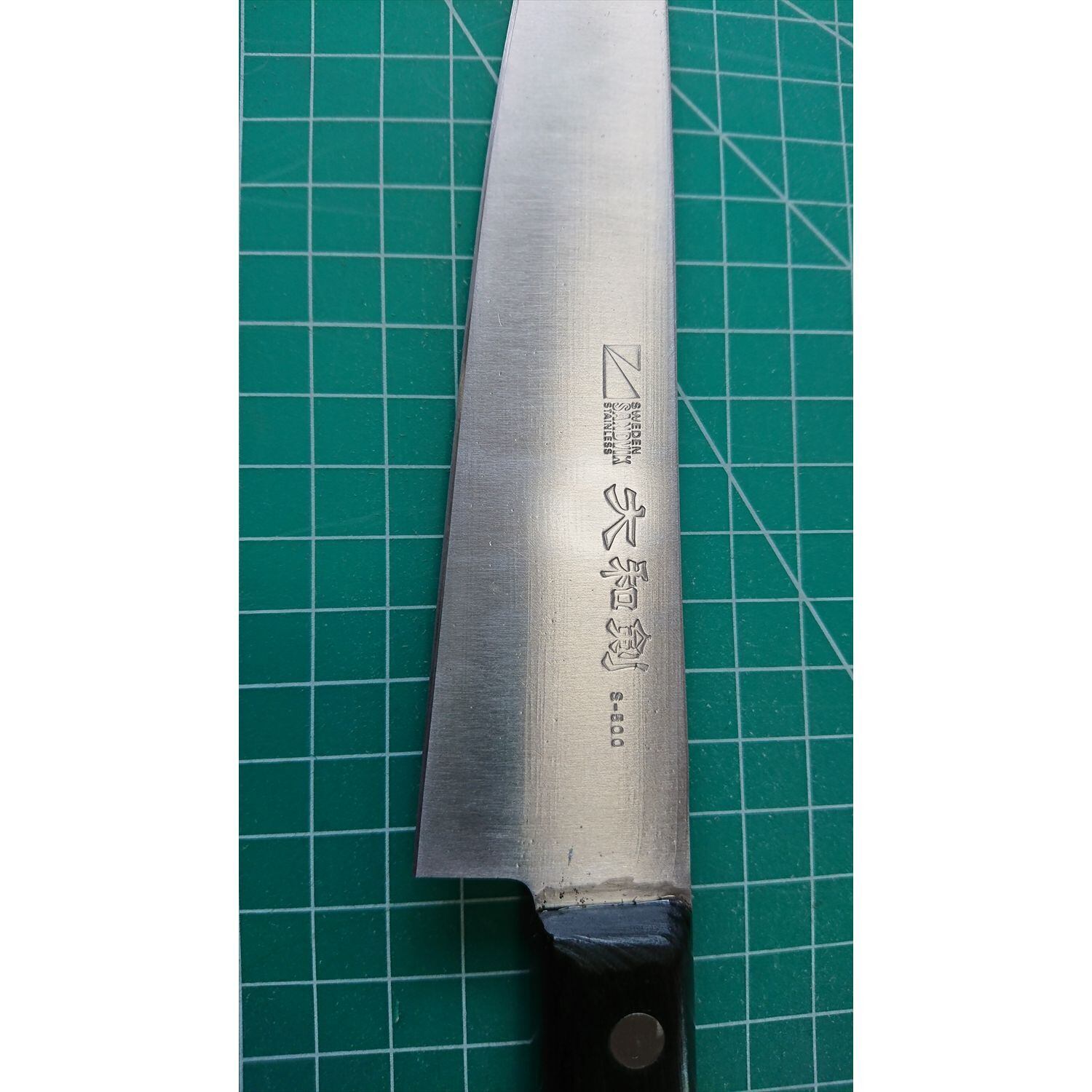 1. o2348/状態:中古/銘:大和剣/牛刀(両刃 左5:右5 右利き・左利き兼用)/刃長:175/峰厚 アゴ上:1.7/重量:123/作り:SWEDEN SANDVIK STAINLESS/他:柄に一部割れや隙間があったので、当社にて補修済み