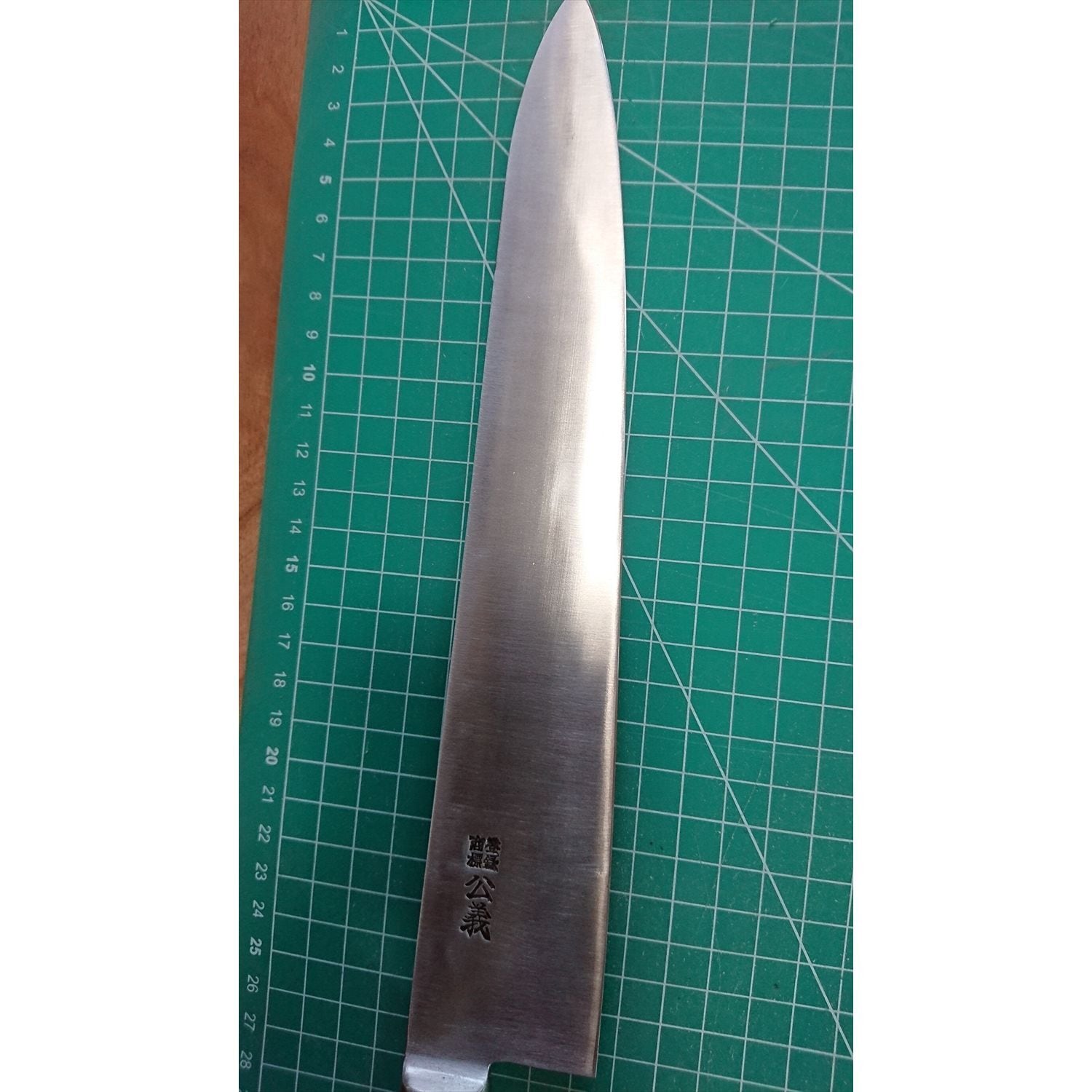 1. o2352/状態:中古/銘:公義/牛刀(両刃 左5:右5 右利き・左利き兼用)/刃長:260/峰厚 アゴ上:1.9/重量:212/作り:日本鋼/他:柄に隙間があったので、当社にて補修済み