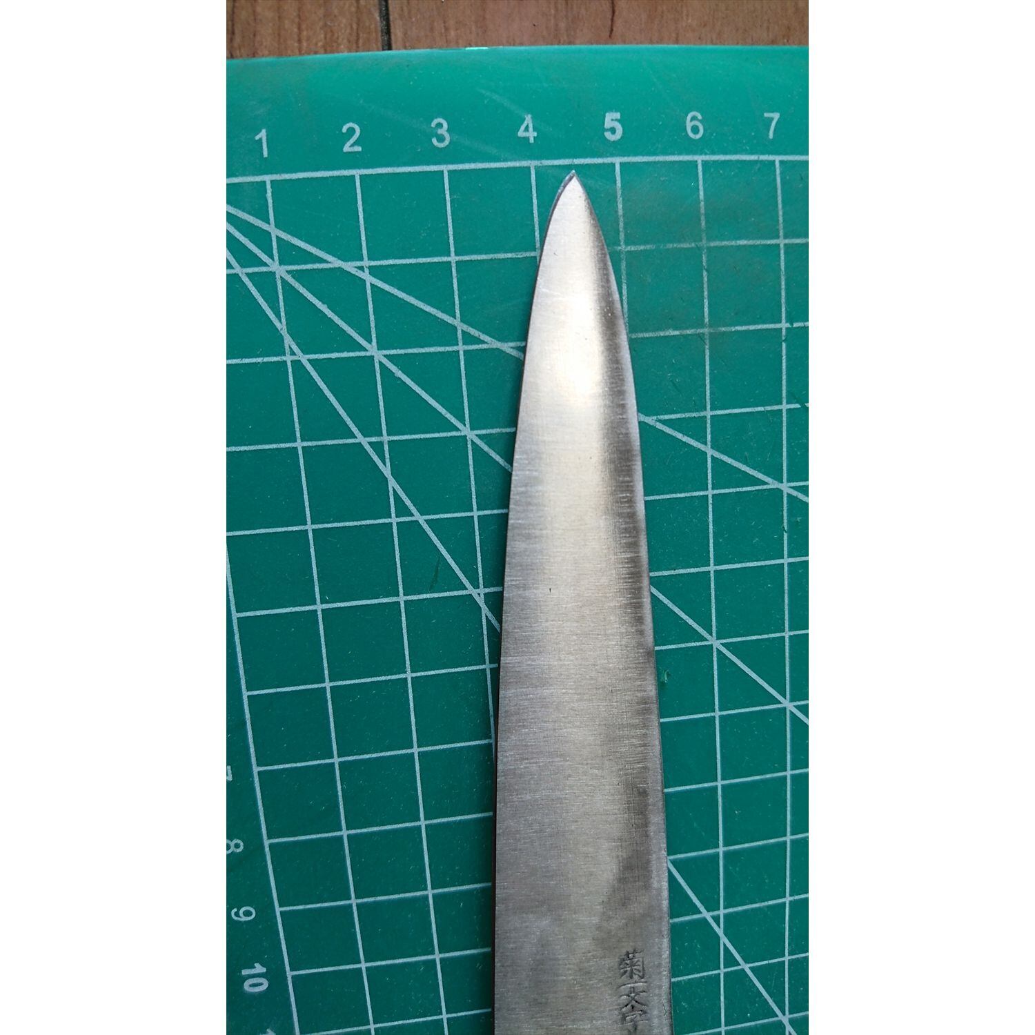 1. o2367/状態:中古/銘:菊一文字/ペティナイフ(両刃 左5:右5 右利き・左利き兼用)/刃長:120/峰厚 アゴ上:1.4/重量:59/作り:鋼/他:
