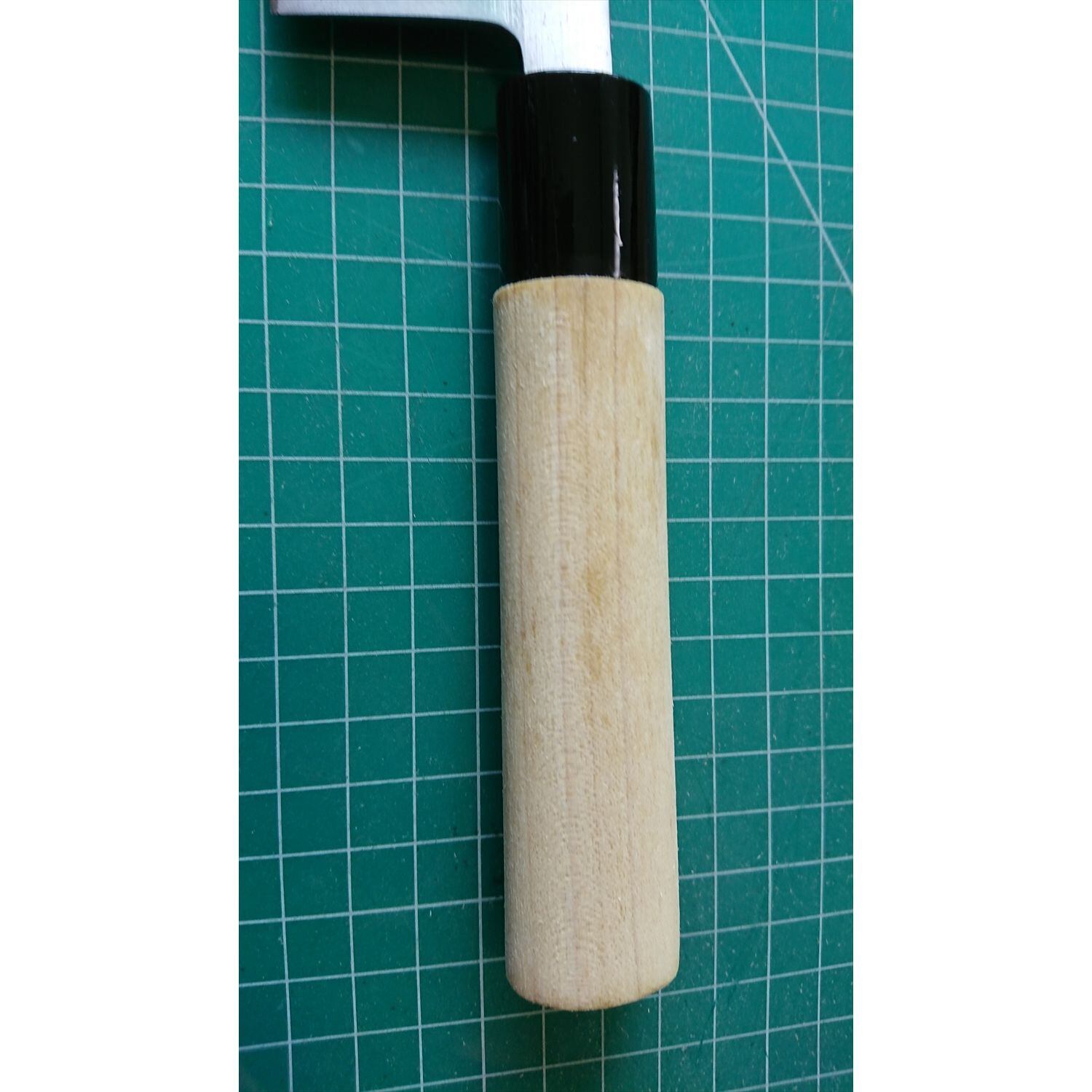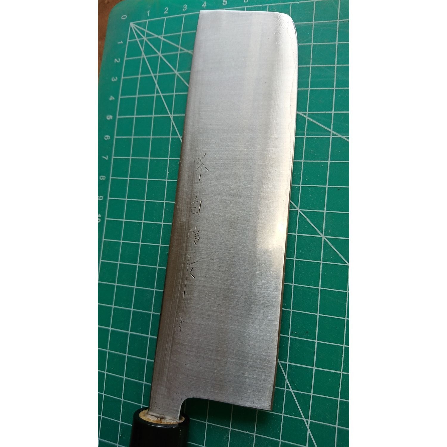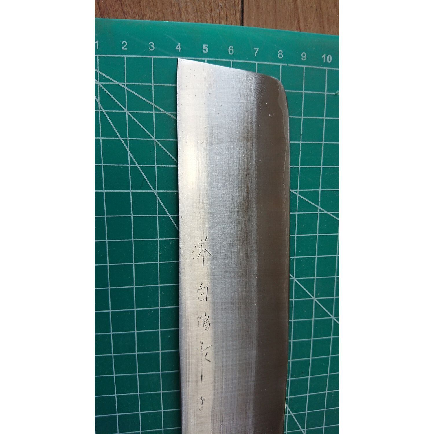 1. o2375/状態:中古/銘:堺白鶴/菜切包丁(両刃 左5:右5 右利き・左利き兼用)/刃長:165/峰厚 アゴ上:2.7/重量:130/作り:?ス鋼(ハイス鋼?をステンレスでサンド)/他:柄は当社にて新品と交換済み