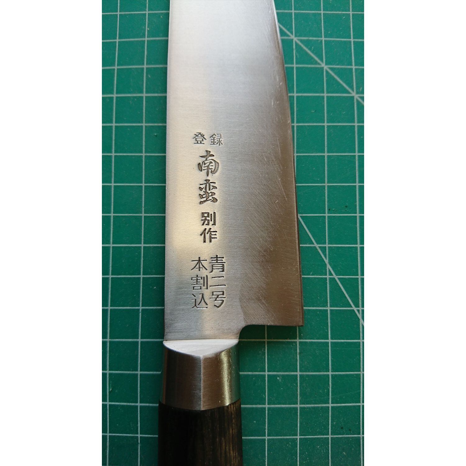 1. o2405/状態:中古/銘:南蛮/三徳包丁(両刃 左5:右5 右利き・左利き兼用)/刃長:175/峰厚 アゴ上:1.6/重量:129/作り:青二号本割込(鋼をステンレスでサンド)/他: