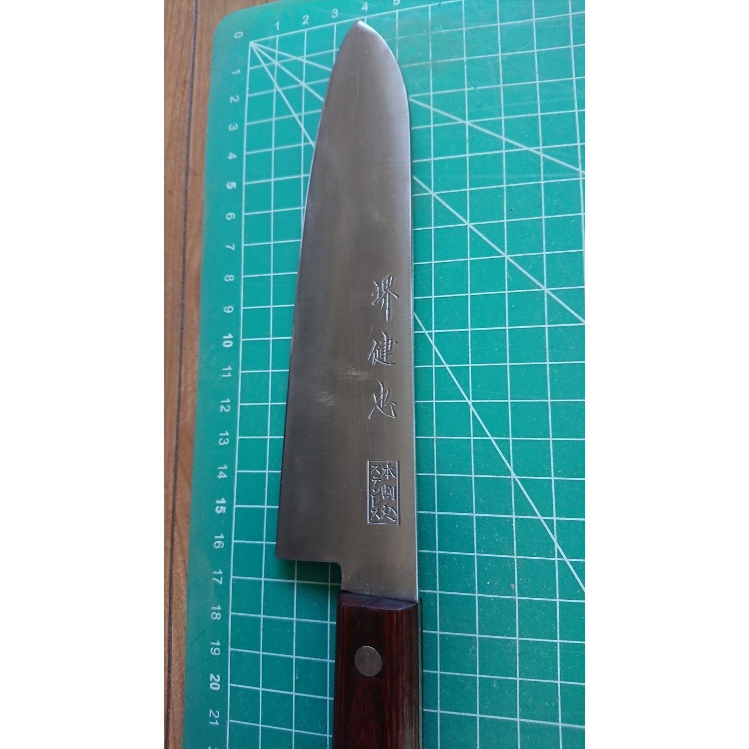 1. o2401/状態:中古/銘:堺健忠/三徳包丁(両刃 左5:右5 右利き・左利き兼用)/刃長:160/峰厚 アゴ上:1.9/重量:135/作り:本割込鋼(鋼をステンレスでサンド)/他:
