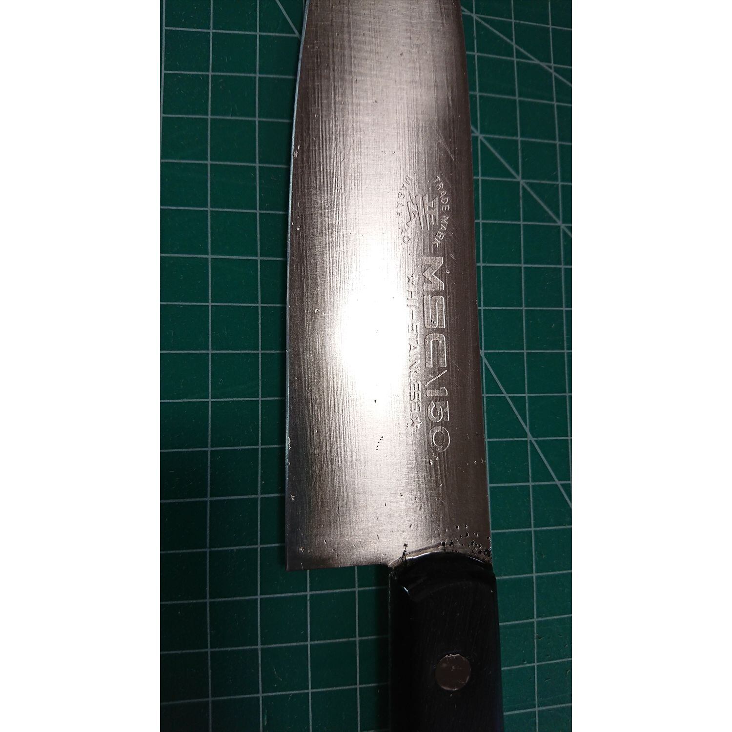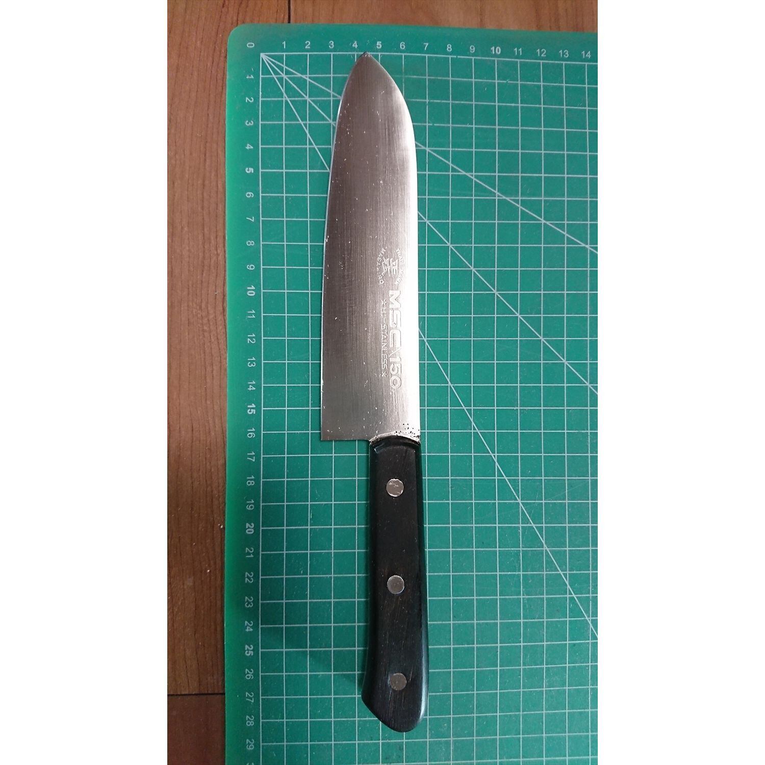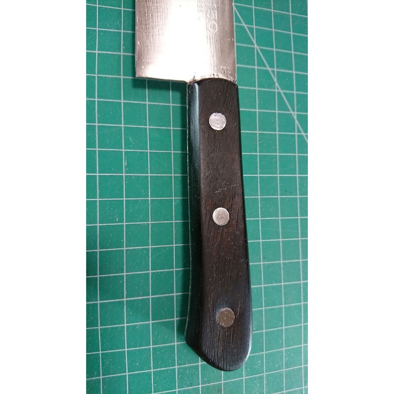 1. o2469/状態:中古/銘:正広 MSC150/三徳包丁(両刃 左5:右5 右利き・左利き兼用)/刃長:165/峰厚 アゴ上:1.6/重量:127/作りステンレス/他:柄に一部隙間があったので、当社にて補修済み