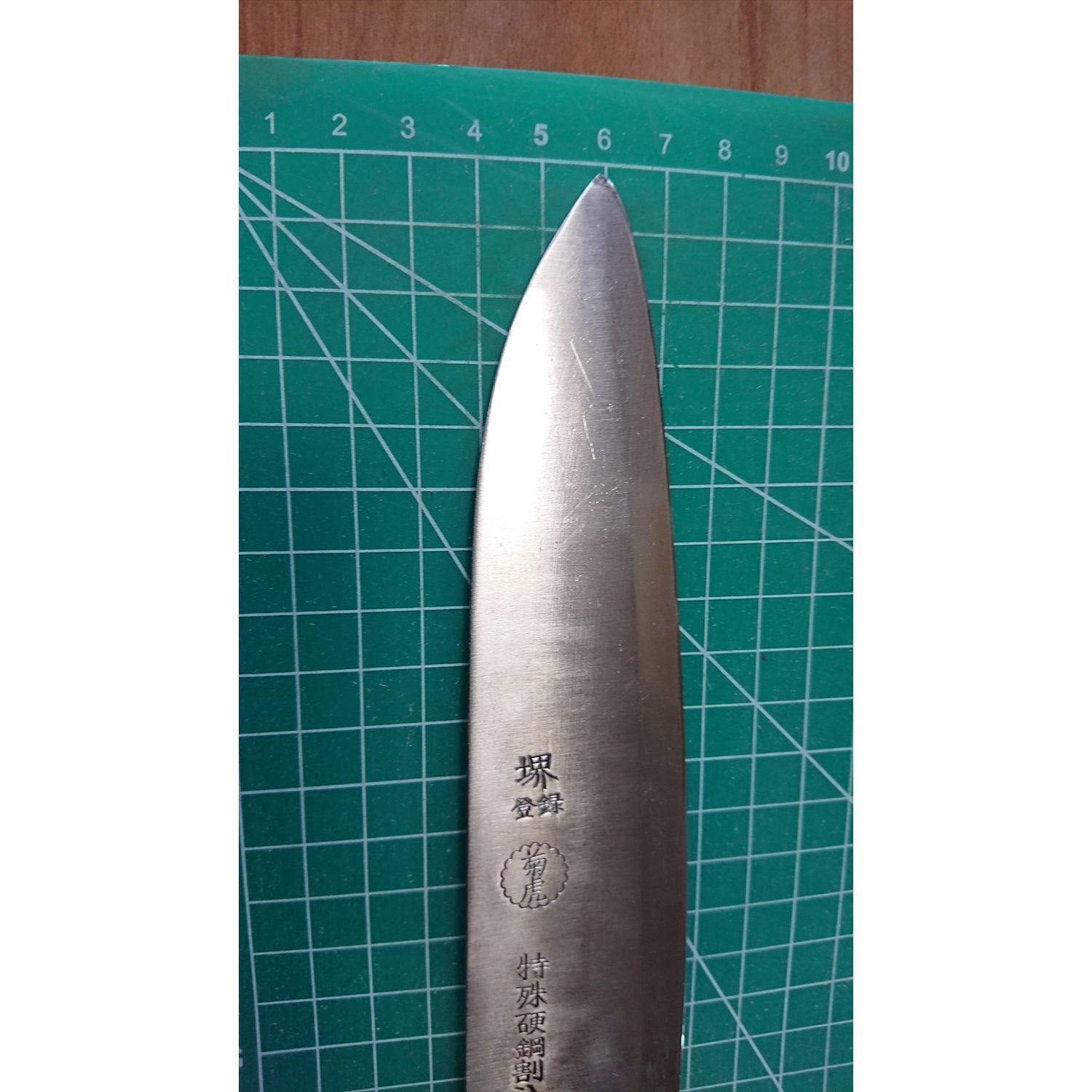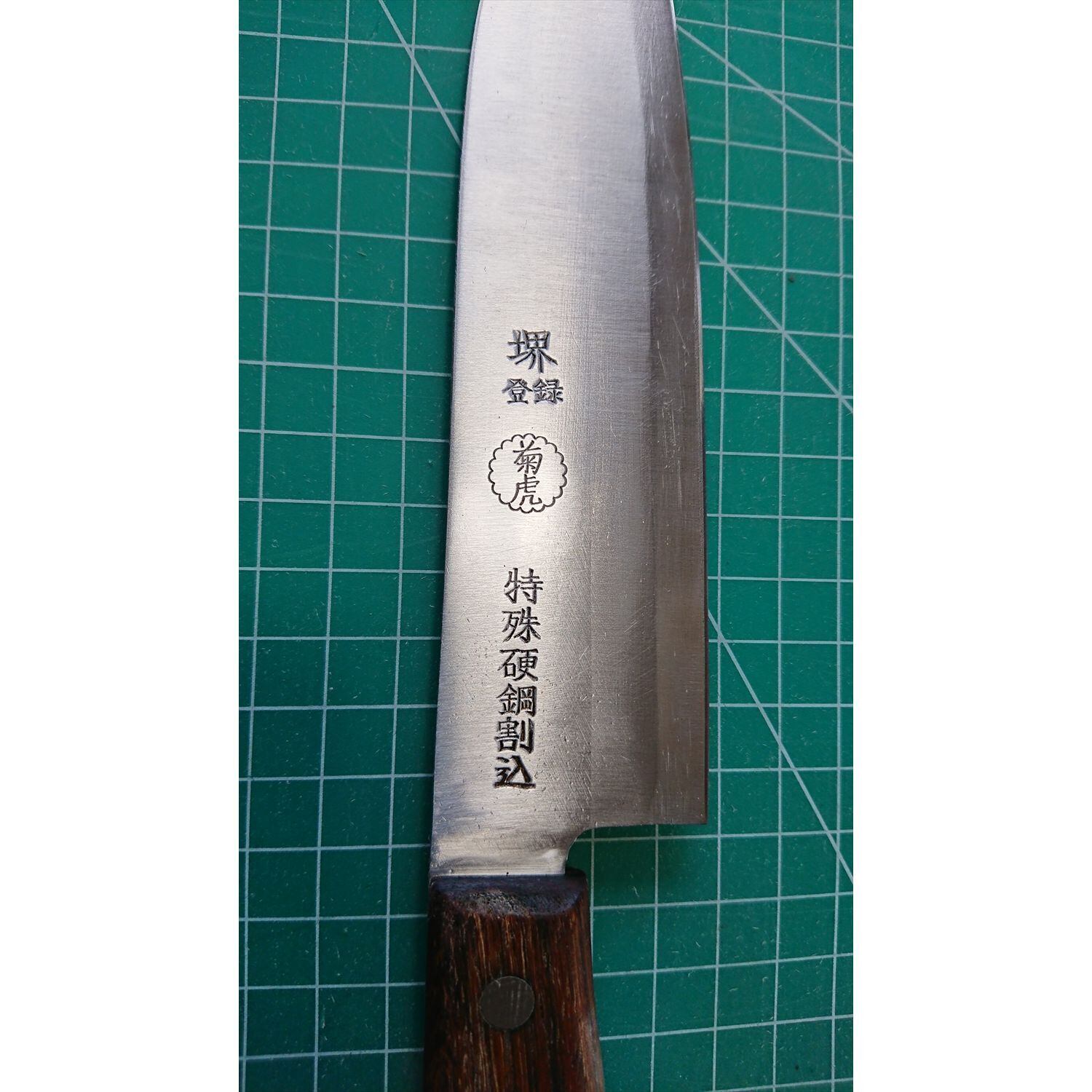 1. o2417/状態:中古/銘:堺菊虎/三徳包丁(両刃 左5:右5 右利き・左利き兼用)/刃長:165/峰厚 アゴ上:1.3/重量:99/作り:特殊硬鋼割込(鋼をステンレスでサンド)/他: