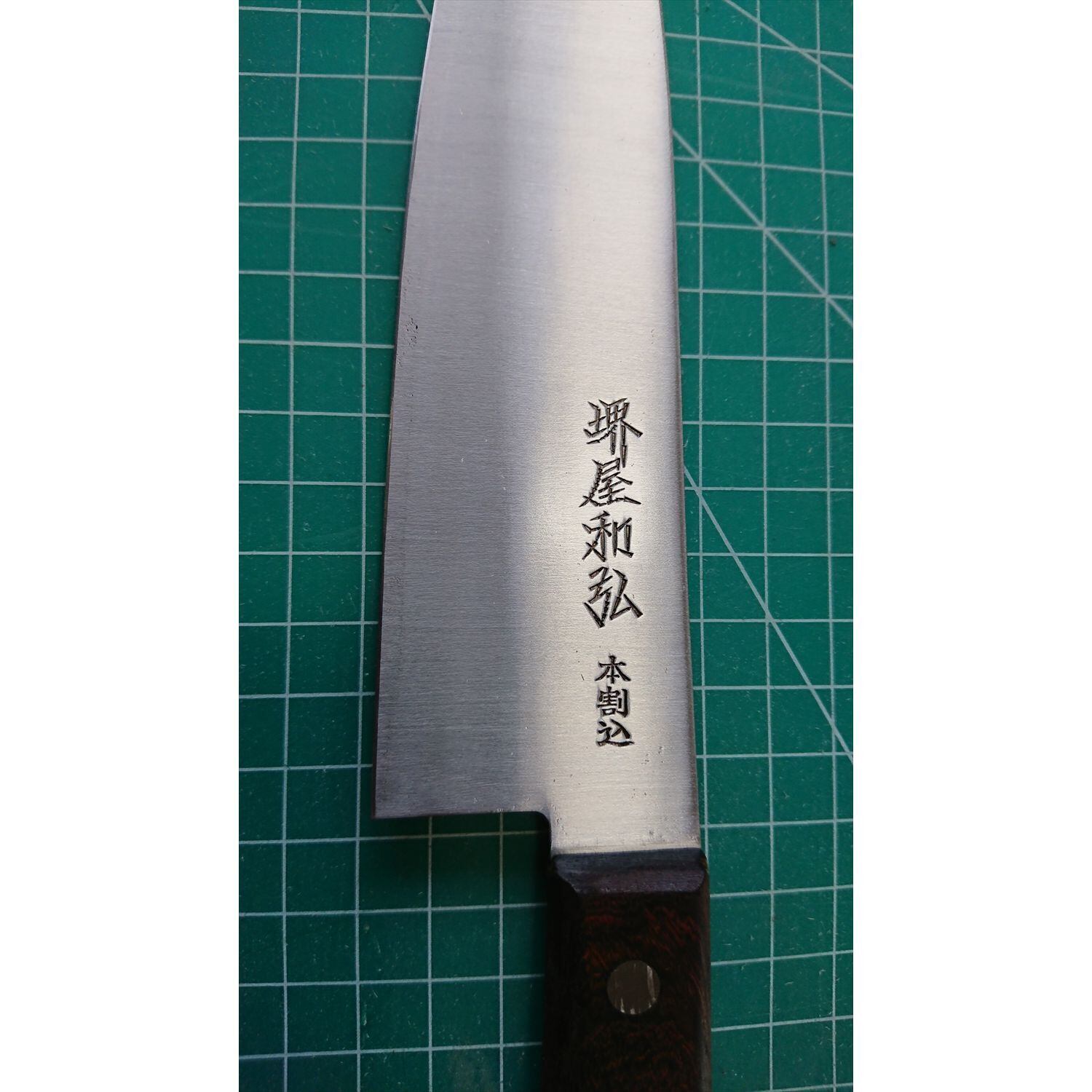 1. o2418/状態:中古/銘:堺屋和弘/三徳包丁(両刃 左5:右5 右利き・左利き兼用)/刃長:165/峰厚 アゴ上:1.4/重量:101/作り:本割込鋼(鋼をステンレスでサンド)/他: