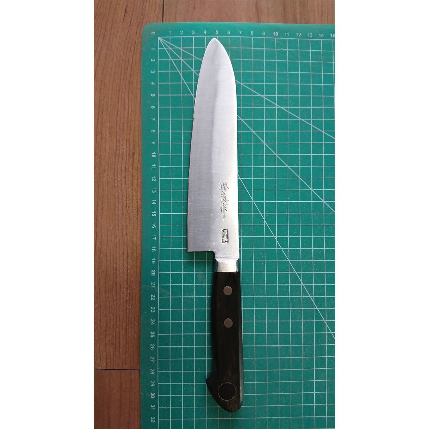 1. o2420/状態:中古/銘:堺真/三徳包丁(両刃 左5:右5 右利き・左利き兼用)/刃長:185/峰厚 アゴ上:1.7/重量:146/作り:本割込鋼(鋼をステンレスでサンド)/他: