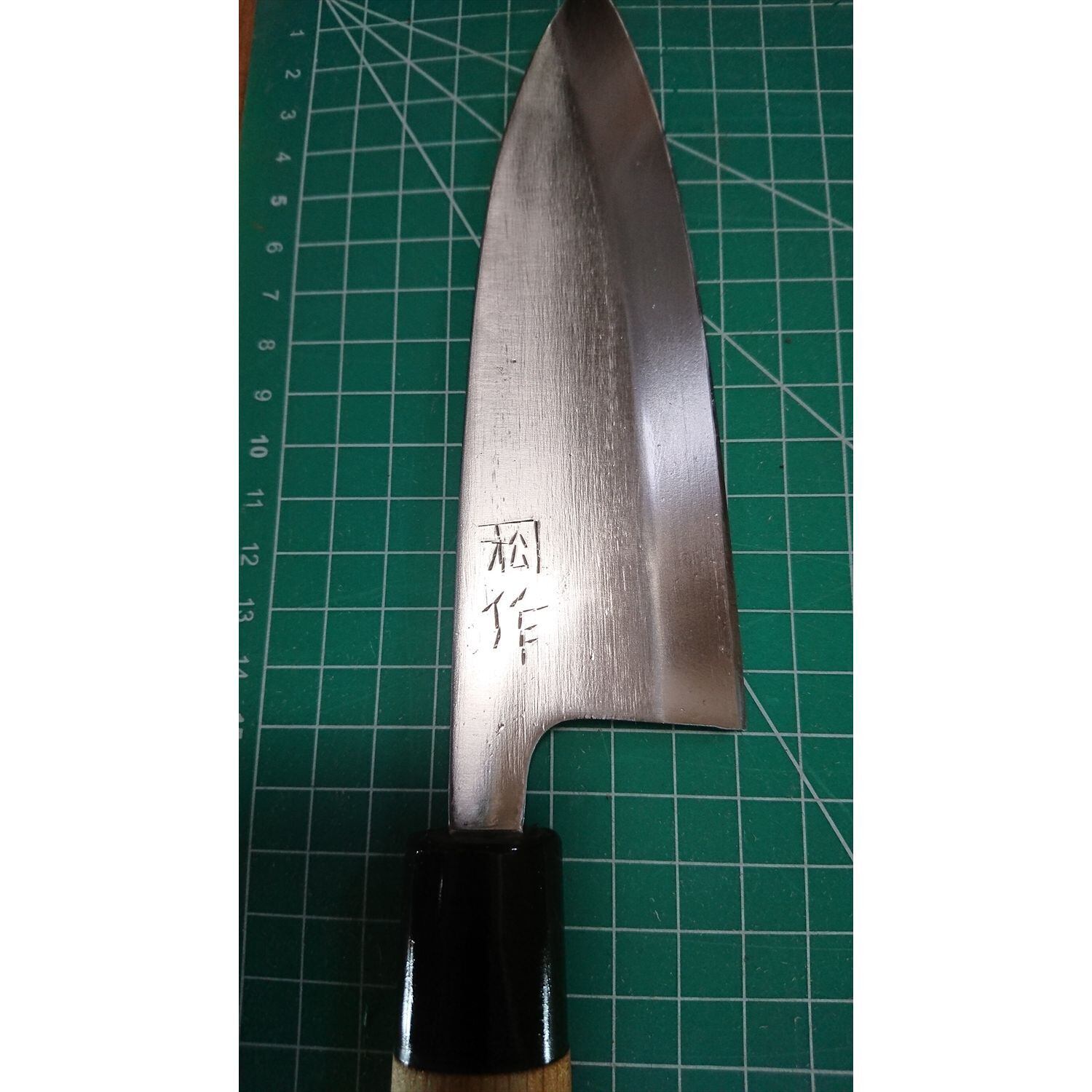 1. o2433/状態:中古/銘:門松/出刃包丁(片刃 右利き用)/刃長:150/峰厚 アゴ上:7.5/重量:238/作り:鋼/他: