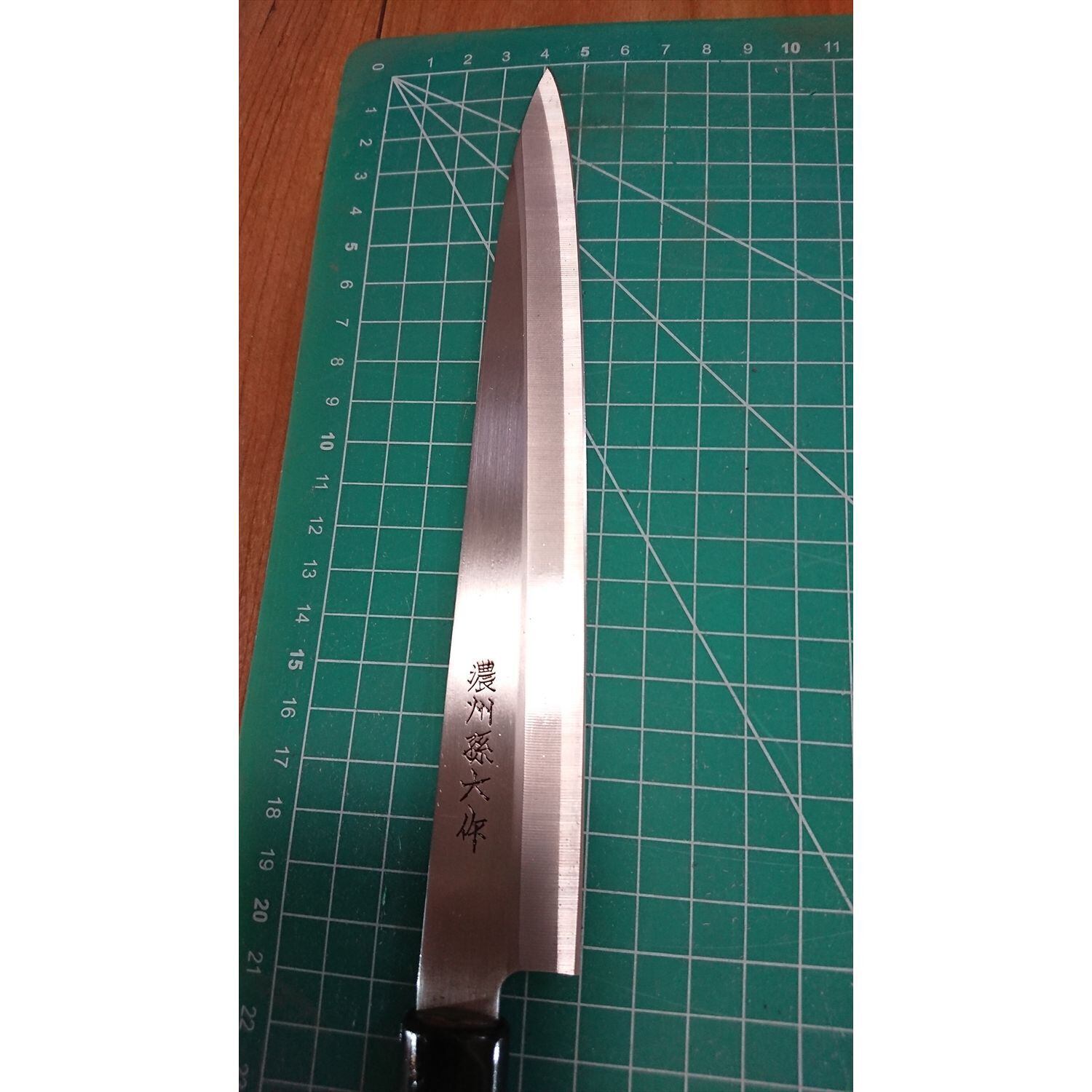1. o2539/状態:中古/銘:濃州孫六/刺身包丁(片刃 右利き用)/刃長:200/峰厚 アゴ上:1.8/重量:78/作り:鋼/他: