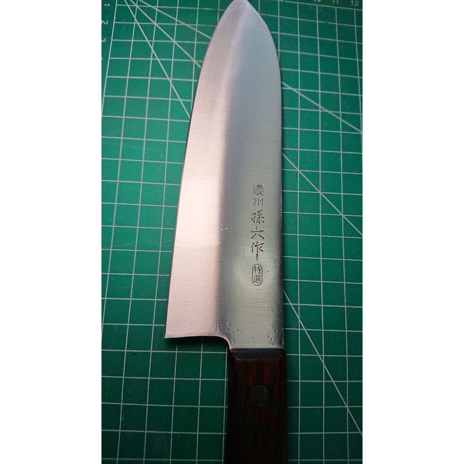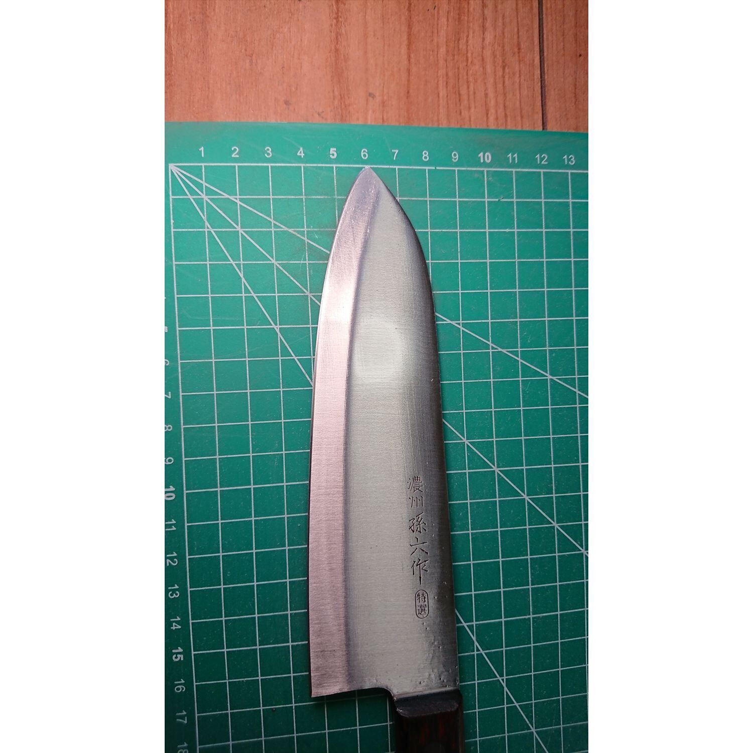 1. o2421/状態:中古/銘:濃州孫六/三徳包丁(両刃 左5:右5 右利き・左利き兼用)/刃長:165/峰厚 アゴ上:1.4/重量:107/作り:鋼/他: