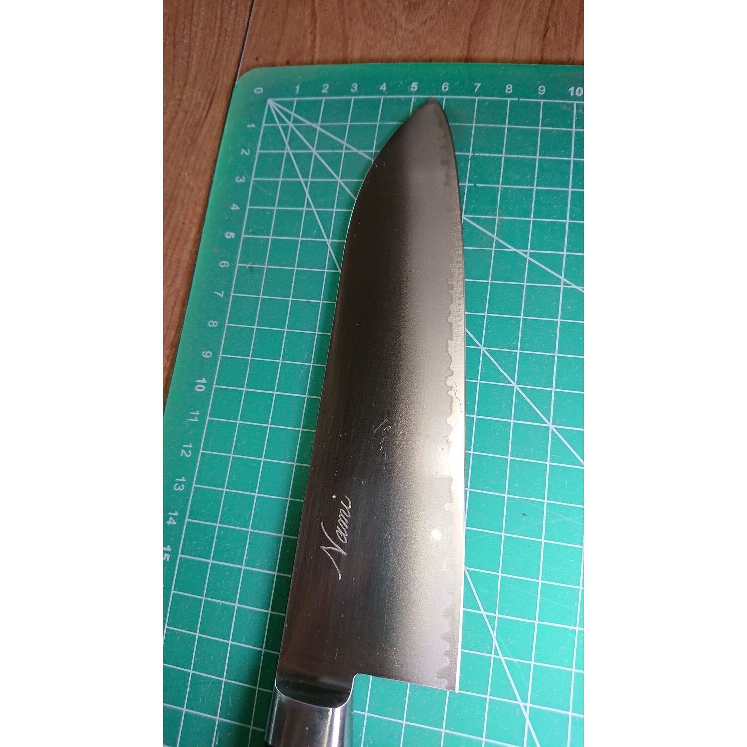 1. o2553/状態:中古/銘:Nami/三徳包丁(両刃 左5:右5 右利き・左利き兼用)/刃長:170/峰厚 アゴ上:1.7/重量:155/作り:GOLD本割込(鋼をステンレスでサンド)/他: