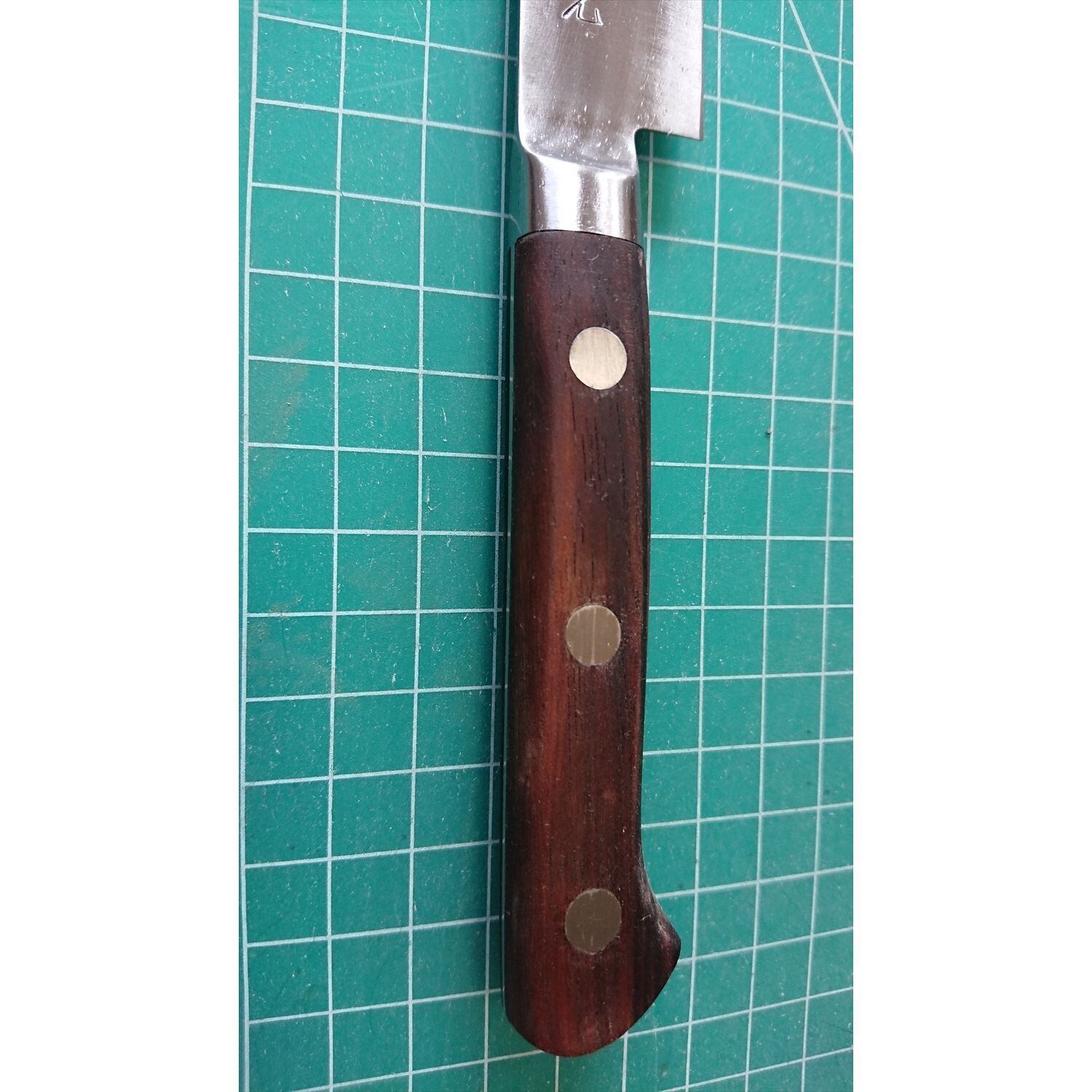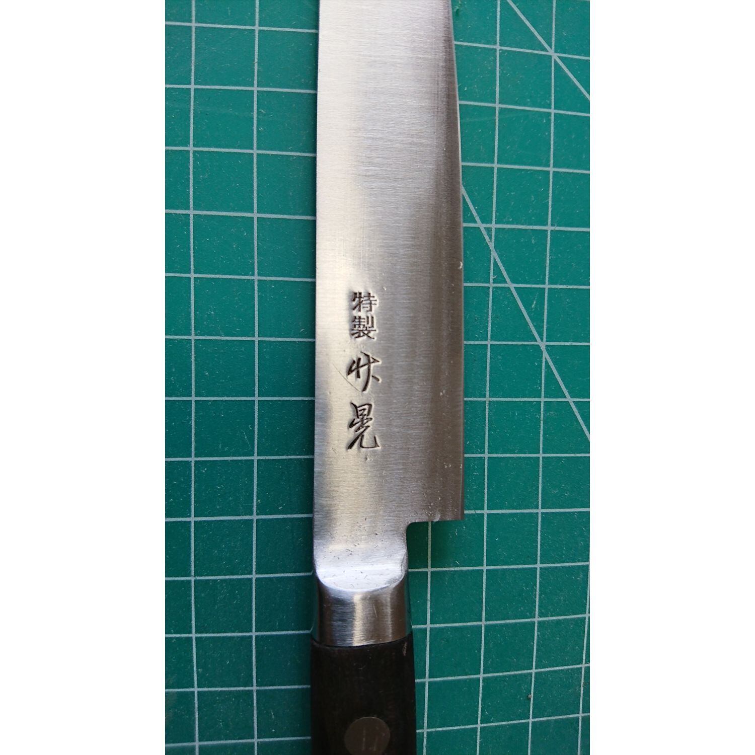 1. o2570/状態:中古/銘:竹晃/ペティナイフ(両刃 左5:右5 右利き・左利き兼用)/刃長:150/峰厚 アゴ上:1.4/重量:72/作り:鋼/他: