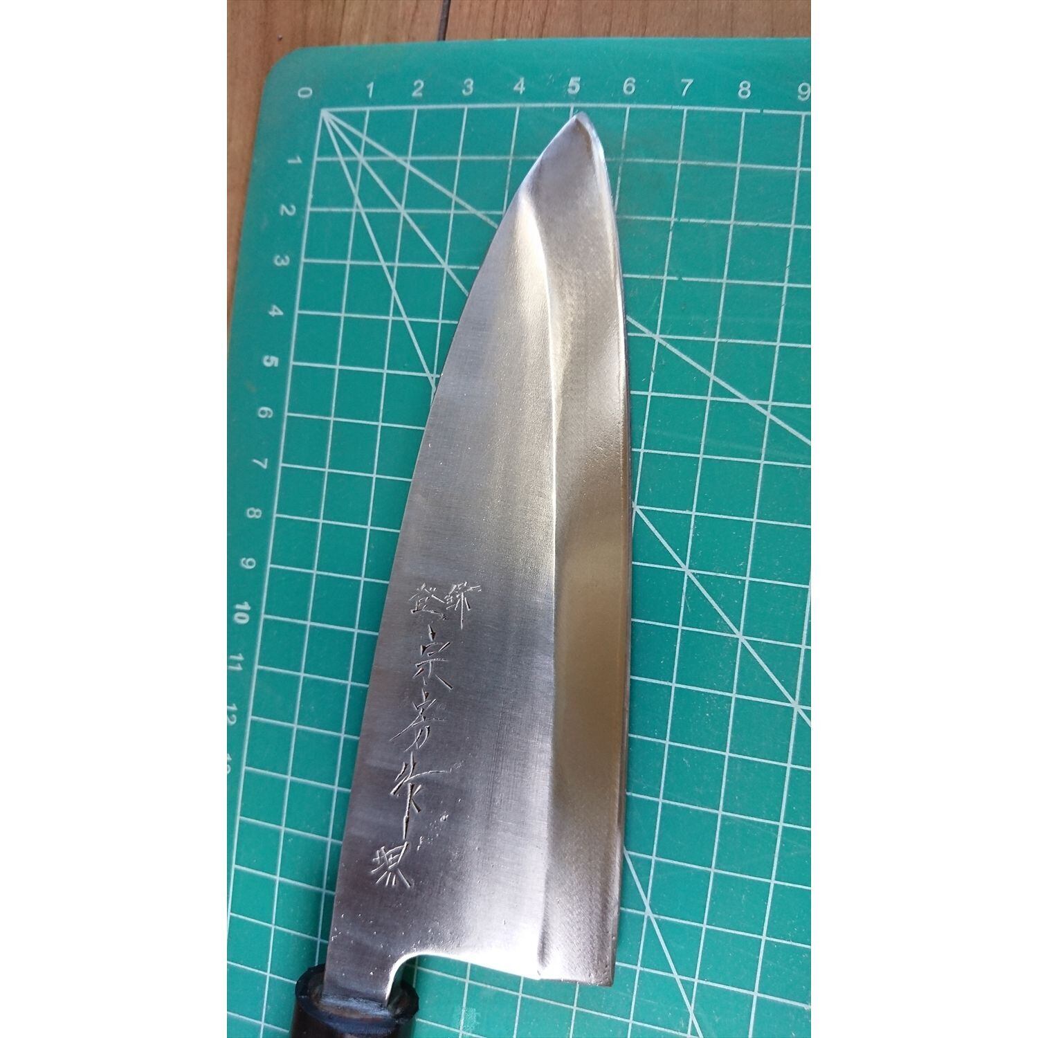 1. o2386/状態:中古/銘:宗房/出刃包丁(片刃 右利き用)/刃長:150/峰厚 アゴ上:8.1/重量:247/作り:鋼/他: