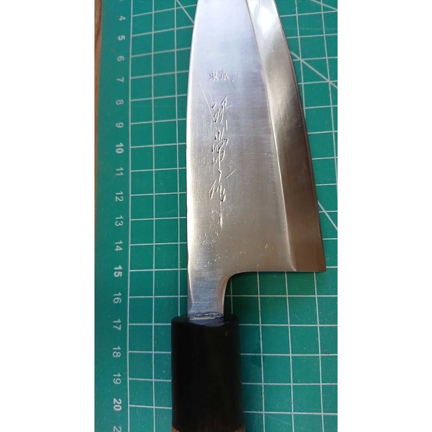 1. o2410/状態:中古/銘:東京研常/出刃包丁(片刃 右利き用)/刃長:150/峰厚 アゴ上:7.5/重量:256/作り:鋼 水牛柄/他: