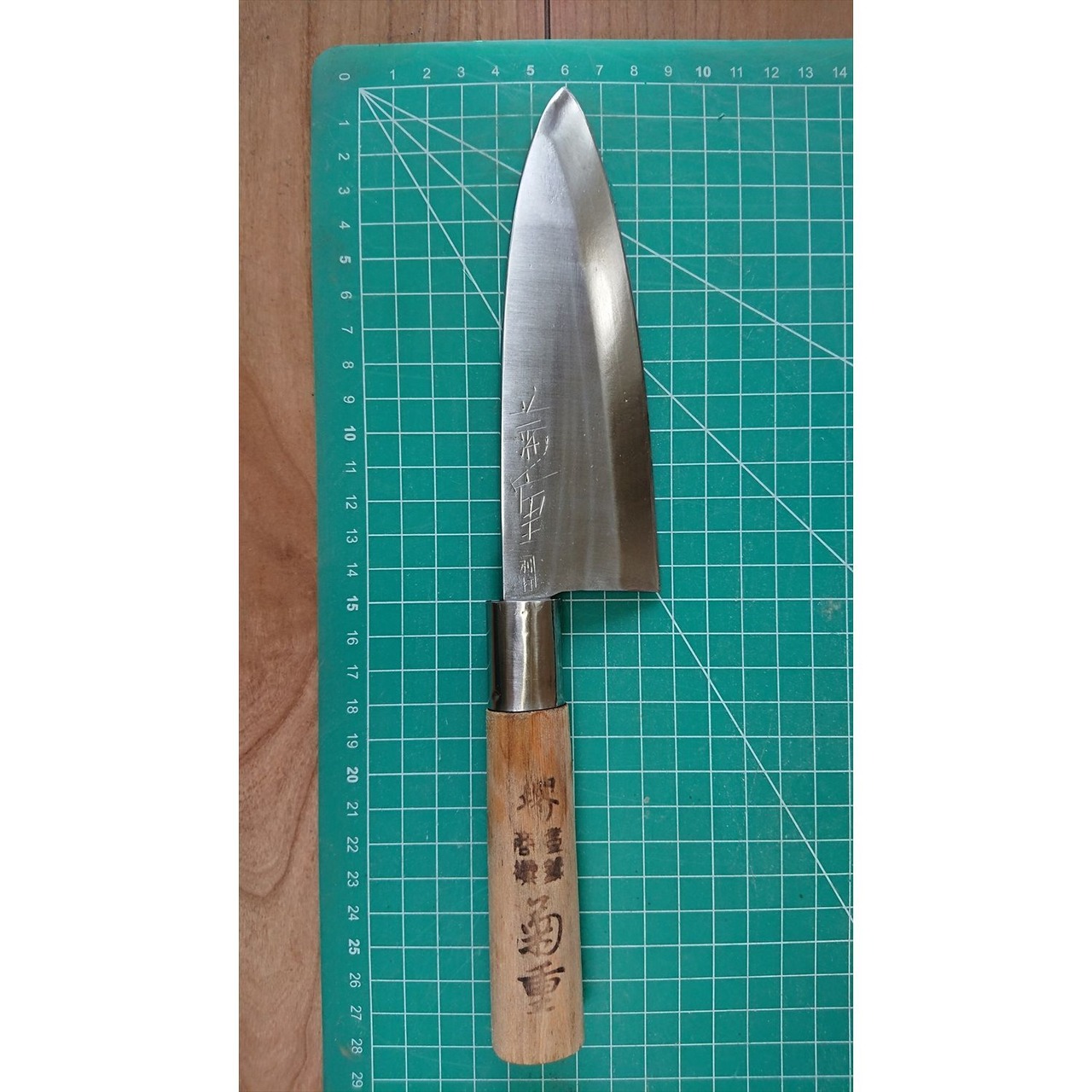 1. o2411/状態:中古/銘:堺菊重/出刃包丁(片刃 右利き用)/刃長:150/峰厚 アゴ上:8/重量:223/作り:鋼/他: