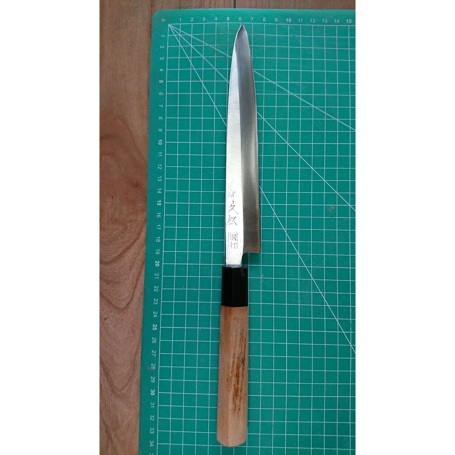 1. o2428/状態:中古/銘:堺久松/刺身包丁(片刃 右利き用)/刃長:190/峰厚 アゴ上:2.7/重量:109/作り:別打(白鋼?)/他: