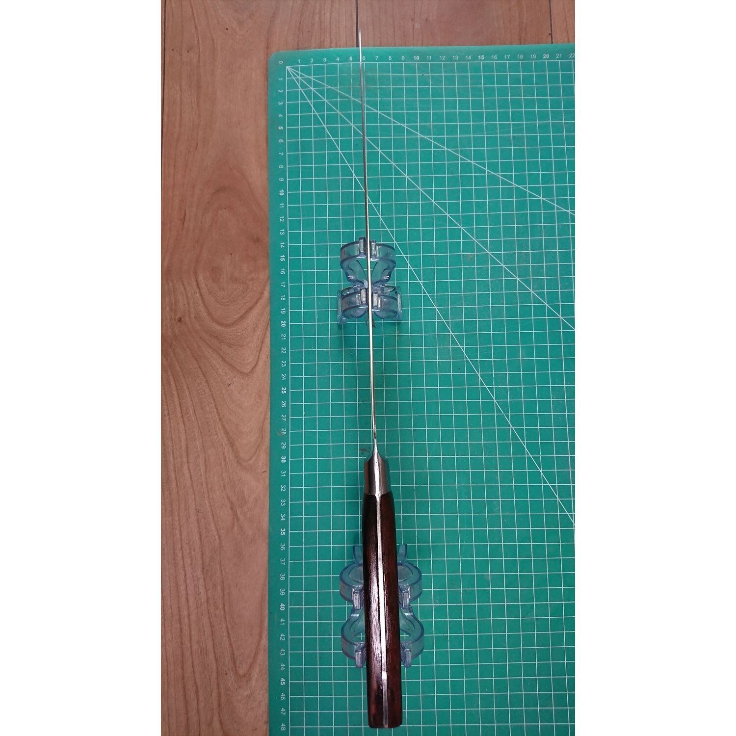 1. o2562/状態:中古/銘:竹晃/牛刀(両刃 左5:右5 右利き・左利き兼用)/刃長:230/峰厚 アゴ上:1.7/重量:180/作り:鋼/他:ツバの根元から柄全体にかけて樹脂コーティング済み(防サビの為)