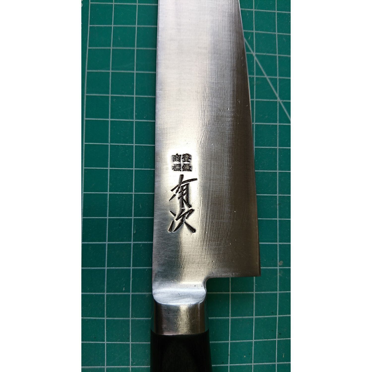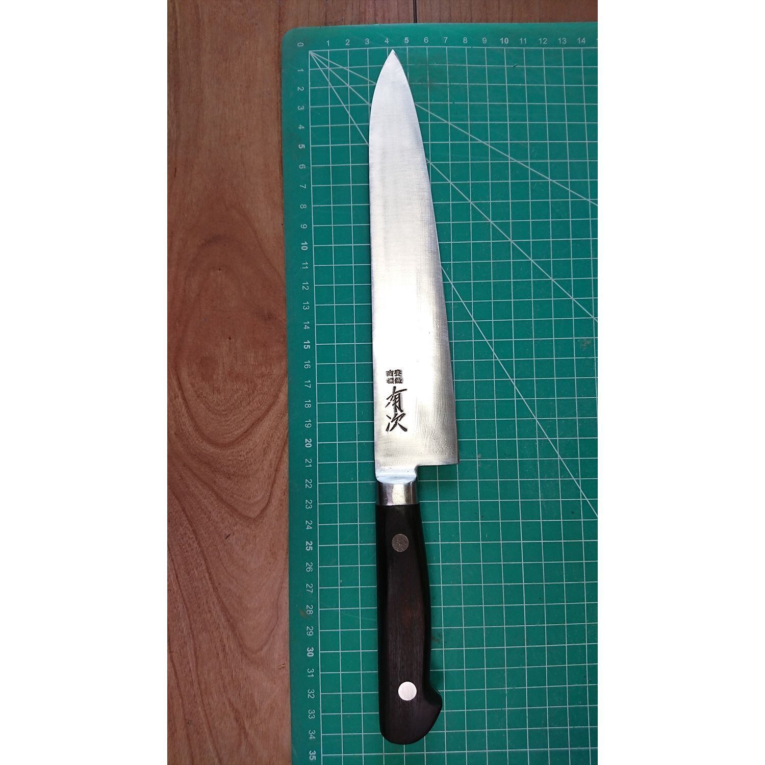 1. o2619/状態:中古/銘:有次/牛刀(両刃 左5:右5 右利き・左利き兼用)/刃長:210/峰厚 アゴ上:1.8/重量:163/作り:鋼 特製/他: