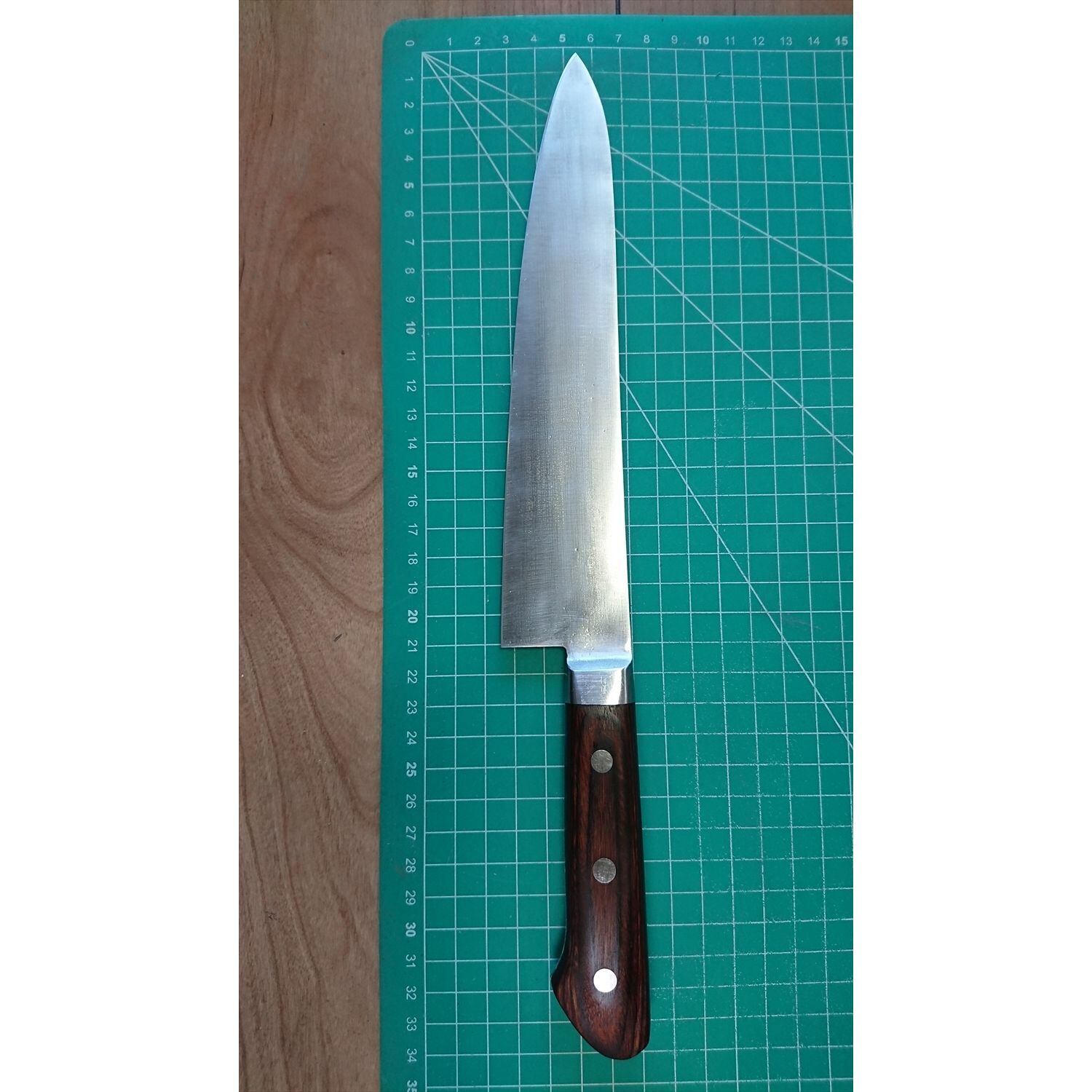 1. o2621/状態:中古/銘:研正/牛刀(両刃 左5:右5 右利き・左利き兼用)/刃長:210/峰厚 アゴ上:1.7/重量:164/作り:不錆鋼/他: