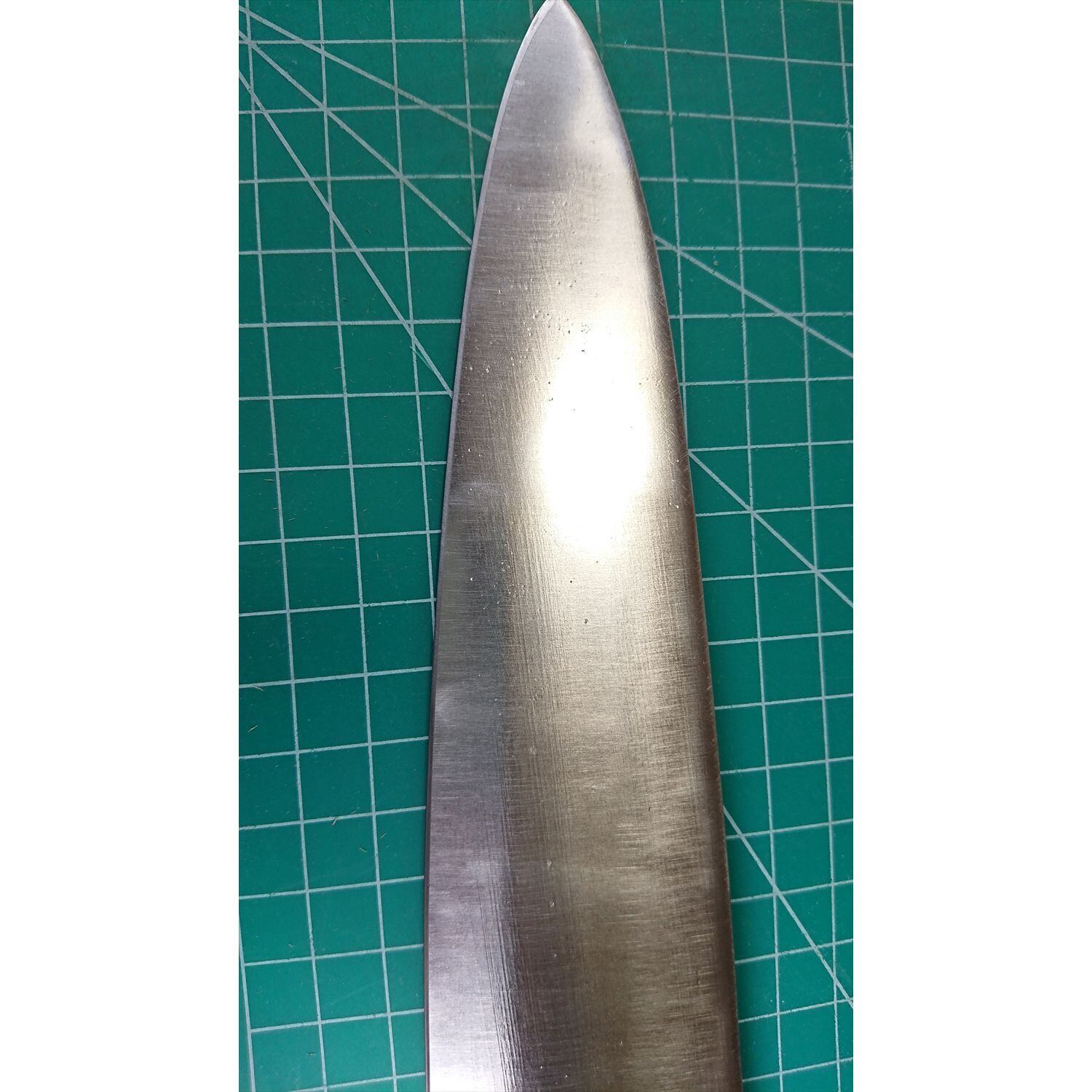 1. o2633/状態:中古/銘:Misono(ミソノ)/牛刀(両刃 左5:右5 右利き・左利き兼用)/刃長:270/峰厚 アゴ上:2.3/重量:254/作り:HANDMADE ステンレスモリブデン鋼/他:ツバの接合部に亀裂痕があるが、少々力を加えてもびくともしなかったので、強度的には問題ないと思います