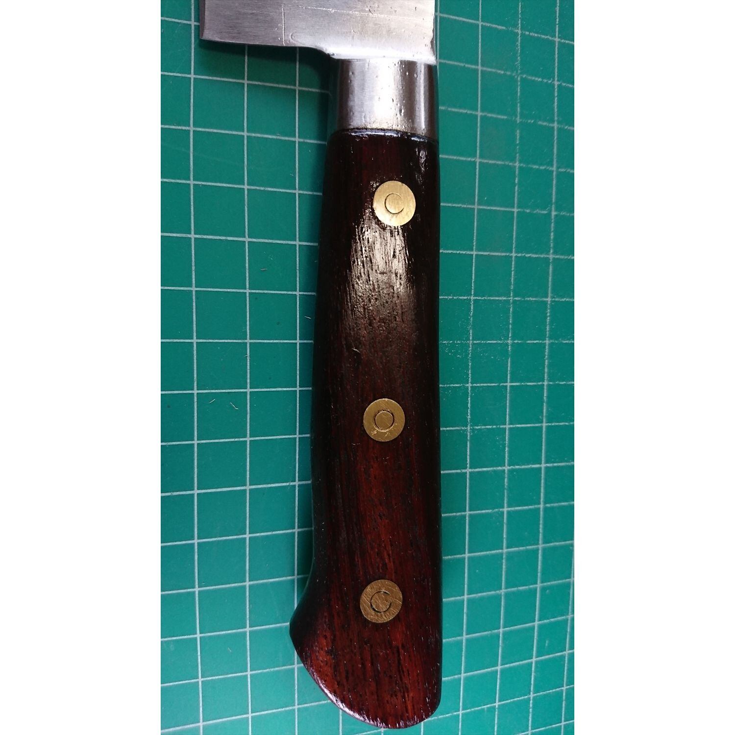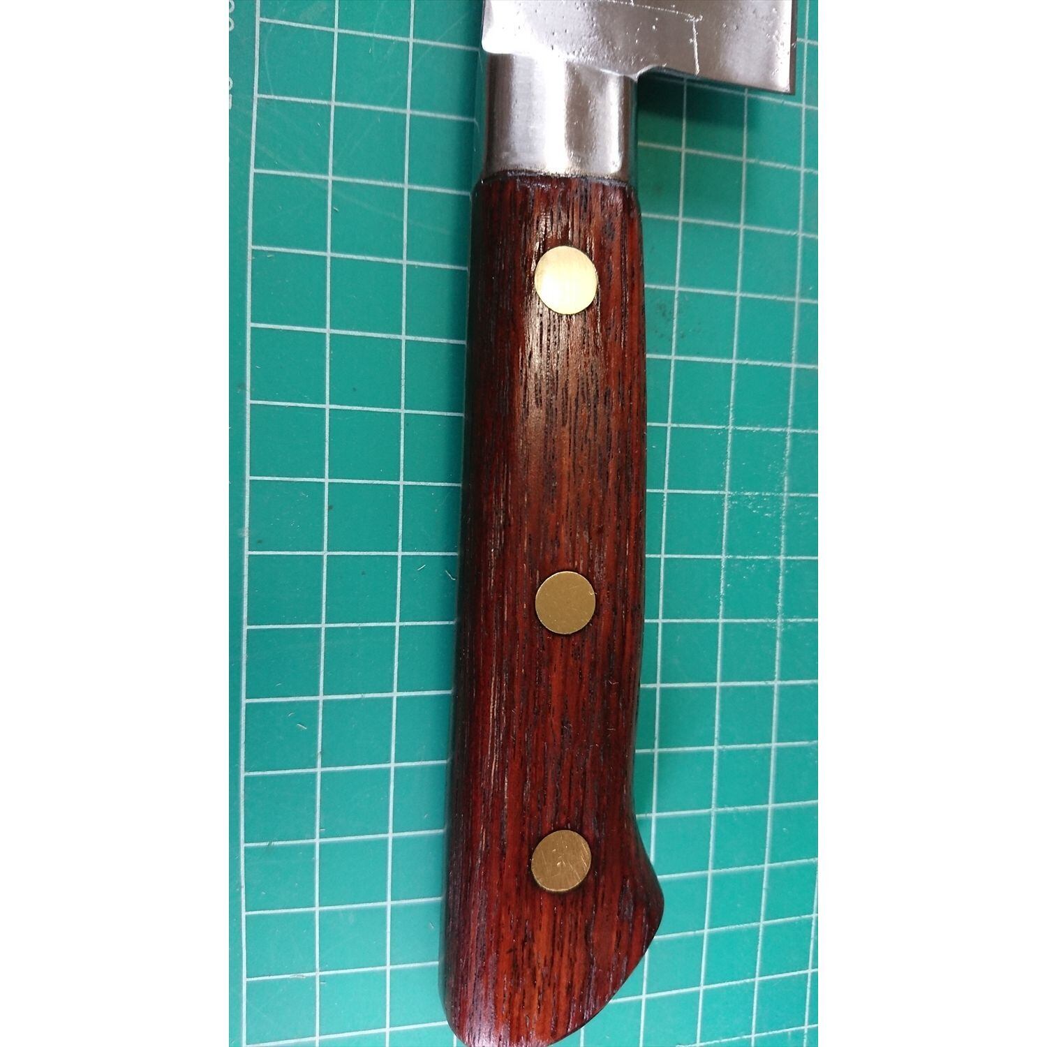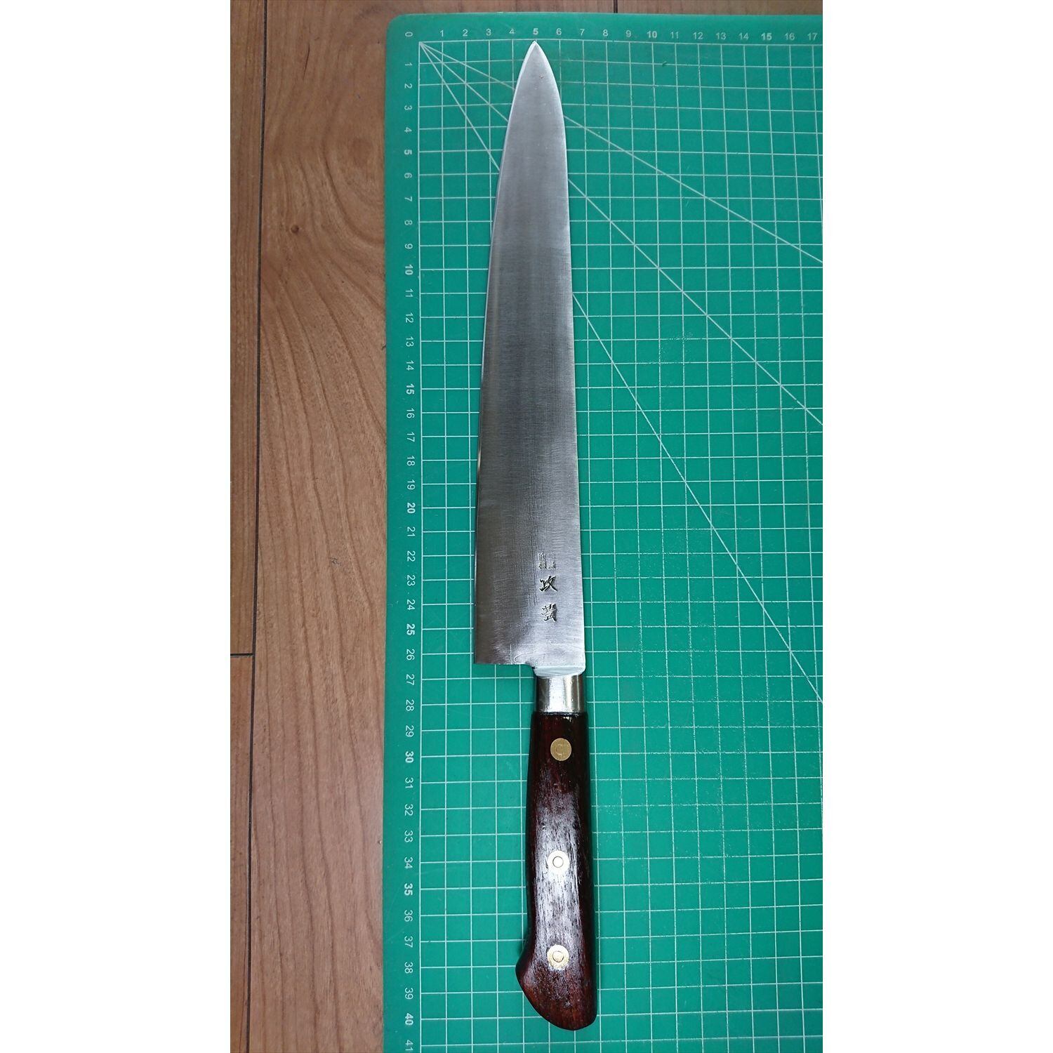 1. o2639/状態:中古/銘:攻豊/牛刀(両刃 左5:右5 右利き・左利き兼用)/刃長:265/峰厚 アゴ上:1.3/重量:182/作り:スウェーデン鋼 最上/他:ツバの根元から柄全体にかけて樹脂コーティング済み(防サビの為)