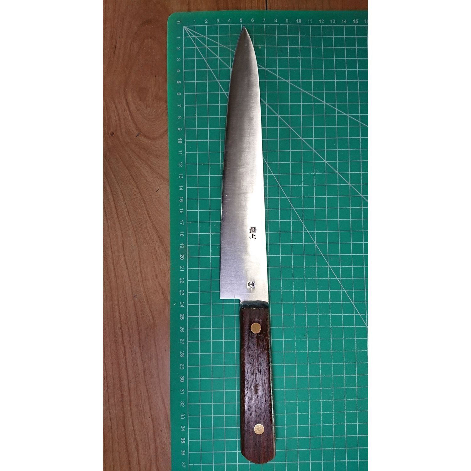 1. o2649/状態:中古/銘:正本/牛刀(両刃 左5:右5 右利き・左利き兼用)/刃長:235/峰厚 アゴ上:1.5/重量:119/作り:鋼 最上 ○M/他:ツバの根元から柄全体にかけて樹脂コーティング済み(防サビの為)