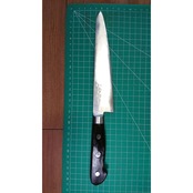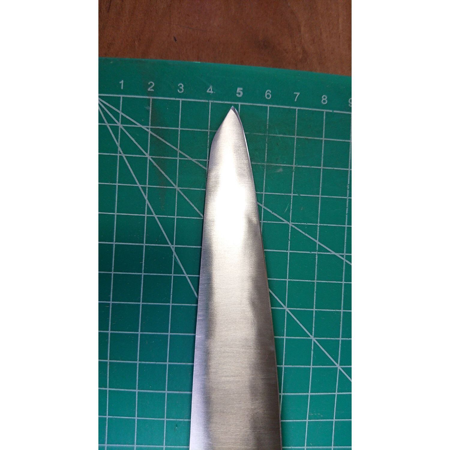 1. o2662/状態:中古/銘:江戸駒/牛刀(両刃 左5:右5 右利き・左利き兼用)/刃長:180/峰厚 アゴ上:1.3/重量:112/作り:鋼/他:柄はオーバーホール済み(リベットは新品交換済み)。ツバの根元から柄全体にかけて樹脂コーティング済み(防サビの為)