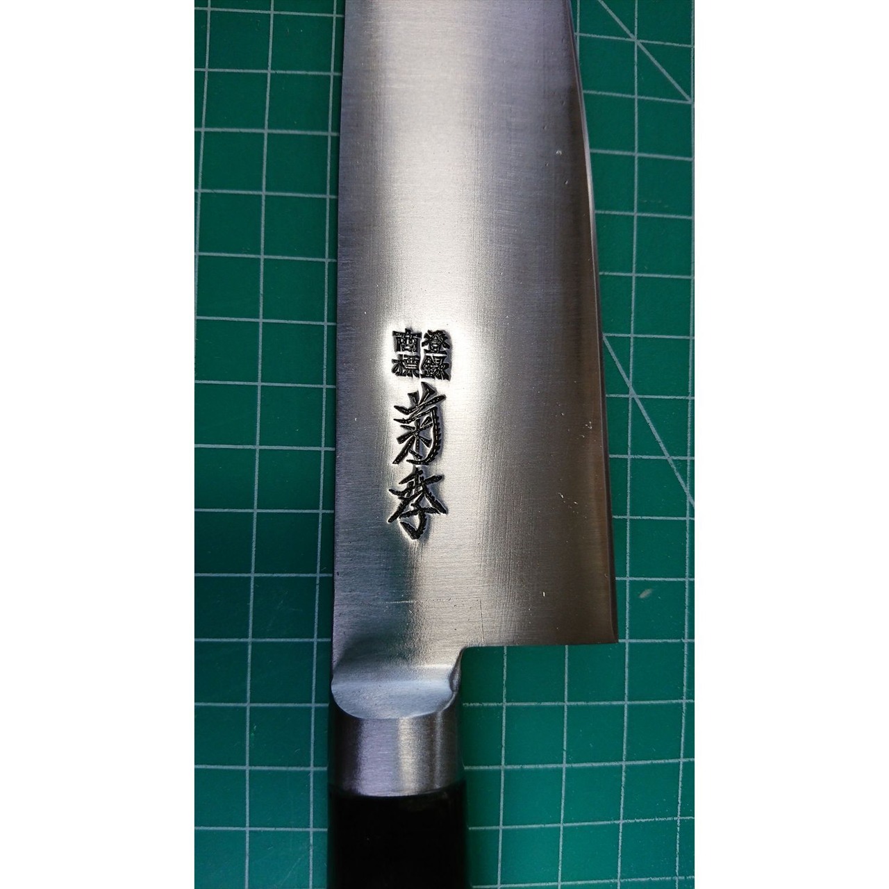 1. o2663/状態:中古/銘:菊季/牛刀(両刃 左5:右5 右利き・左利き兼用)/刃長:180/峰厚 アゴ上:1.7/重量:125/作り:SWEDISHSTEEL K-121/他:柄はオーバーホール済み(リベットは新品交換済み)。ツバの根元から柄全体にかけて樹脂コーティング済み(防サビの為)