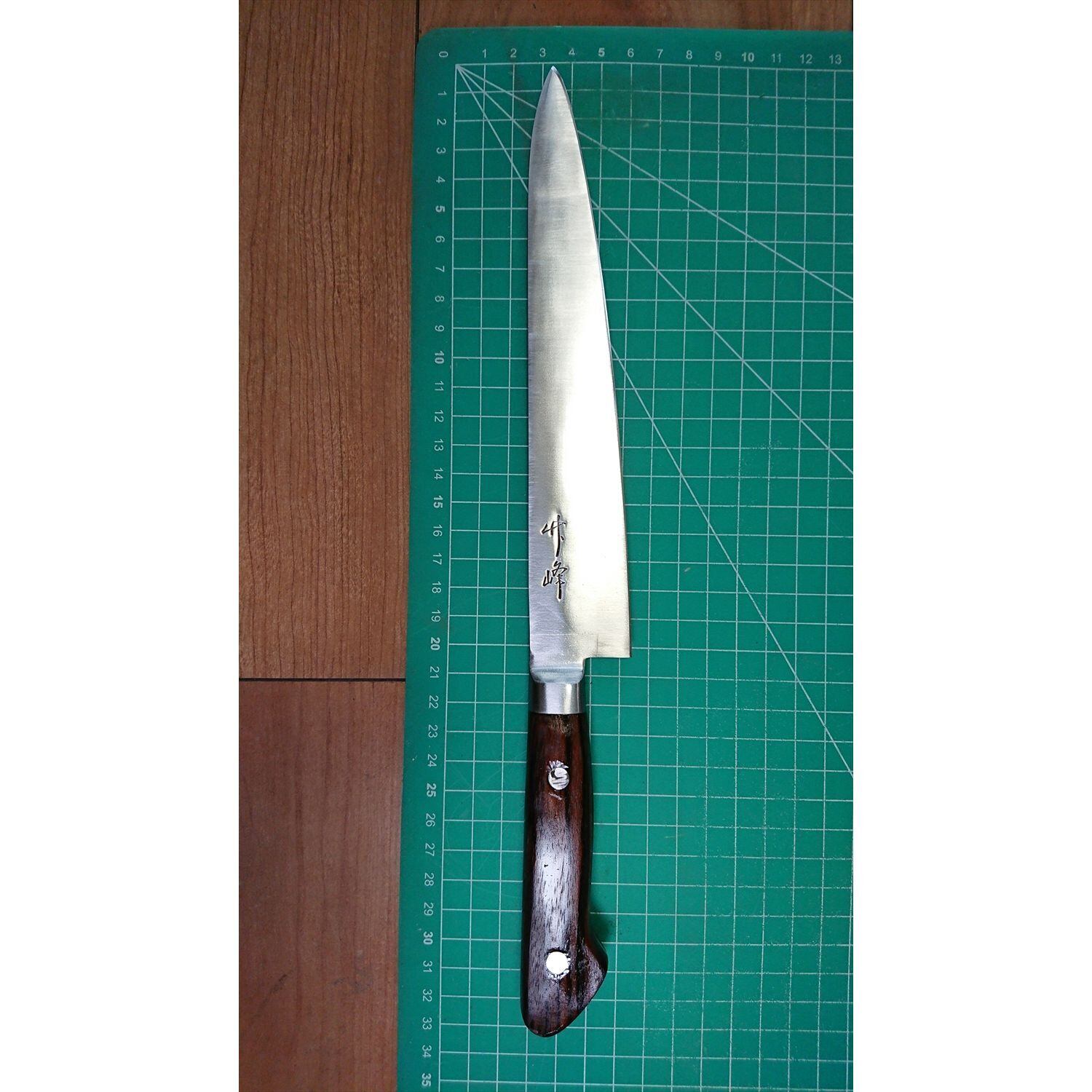 1. o2666/状態:中古/銘:竹峰/牛刀(両刃 左5:右5 右利き・左利き兼用)/刃長:205/峰厚 アゴ上:1.5/重量:122/作り:鋼/他:柄はオーバーホール済み(リベットは新品交換済み)。ツバの根元から柄全体にかけて樹脂コーティング済み(防サビの為)