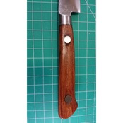 1. o2671/状態:中古/銘:有次/ペティナイフ(両刃 左5:右5 右利き・左利き兼用)/刃長:150/峰厚 アゴ上:1.2/重量:58/作り:別打(白鋼?)/他:銘はほぼ消失。柄はオーバーホール済み(リベットは新品交換済み)。ツバの根元から柄全体にかけて樹脂コーティング済み(防サビの為)