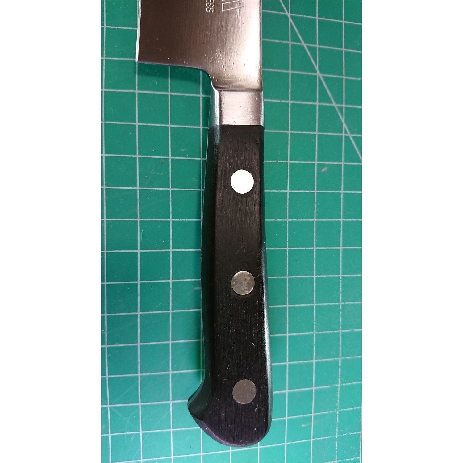 1. o2699/状態:中古/銘:KIYA RUGBY/三徳包丁(両刃 左5:右5 右利き・左利き兼用)/刃長:145/峰厚 アゴ上:2.1/重量:121/作り:CHROMOL STAINLESS/他: