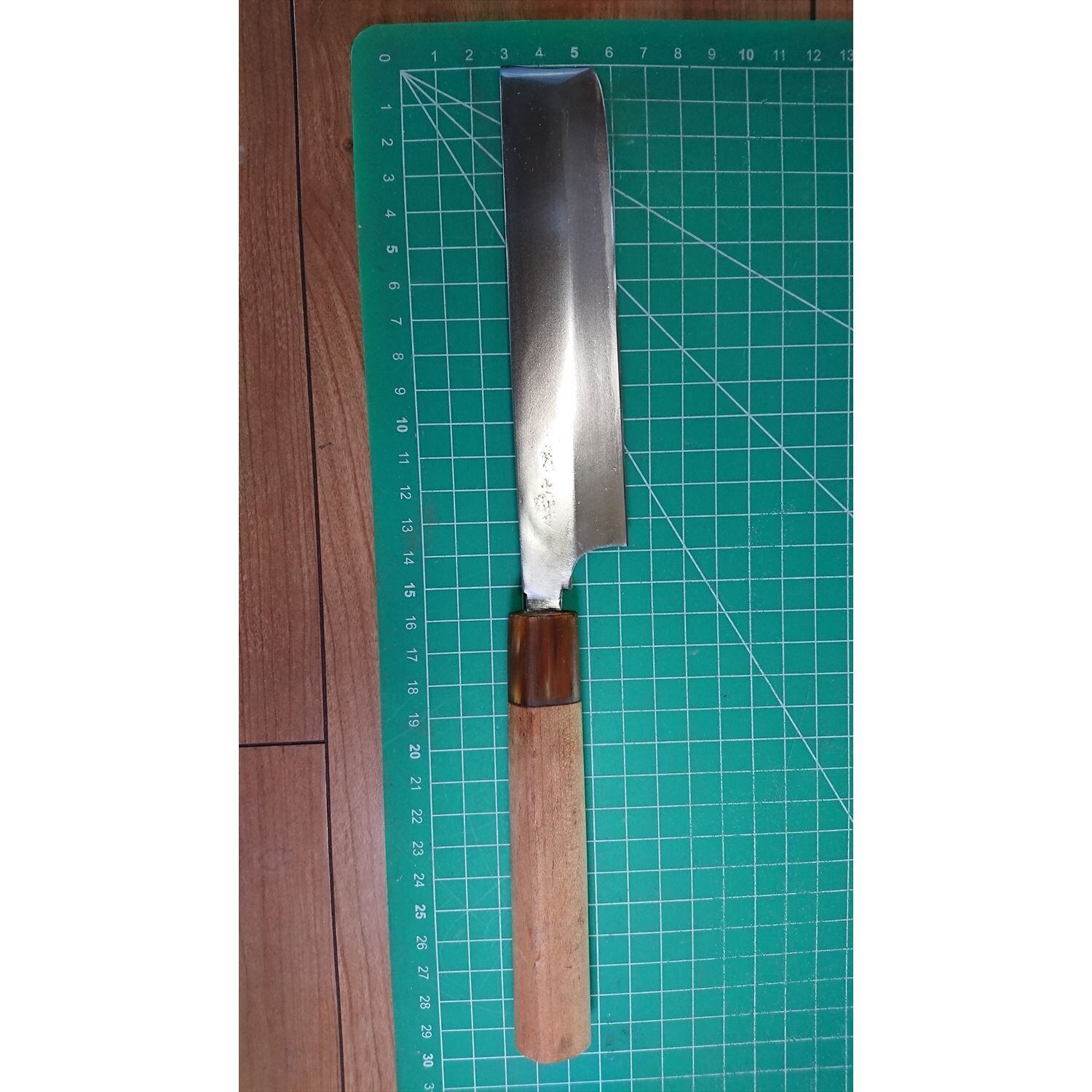1. o2623/状態:中古/銘:正本/薄刃包丁(片刃 右利き用)/刃長:140/峰厚 アゴ上:3/重量:109/作り:鋼 水牛柄/他:銘はほぼ消失