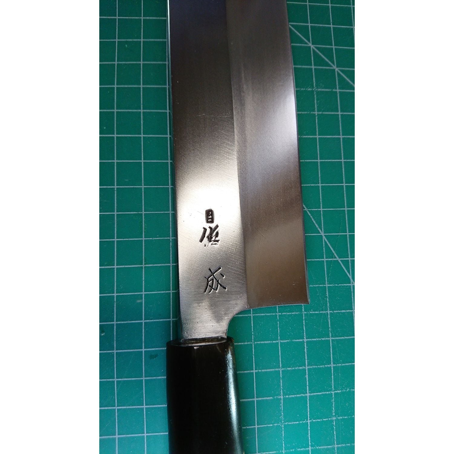 1. o2636/状態:中古/銘:■佑成(スケナリ)/薄刃包丁(片刃 右利き用)/刃長:215/峰厚 アゴ上:3.8/重量:247/作り:鋼 水牛柄/他:水牛柄は少々補修済み