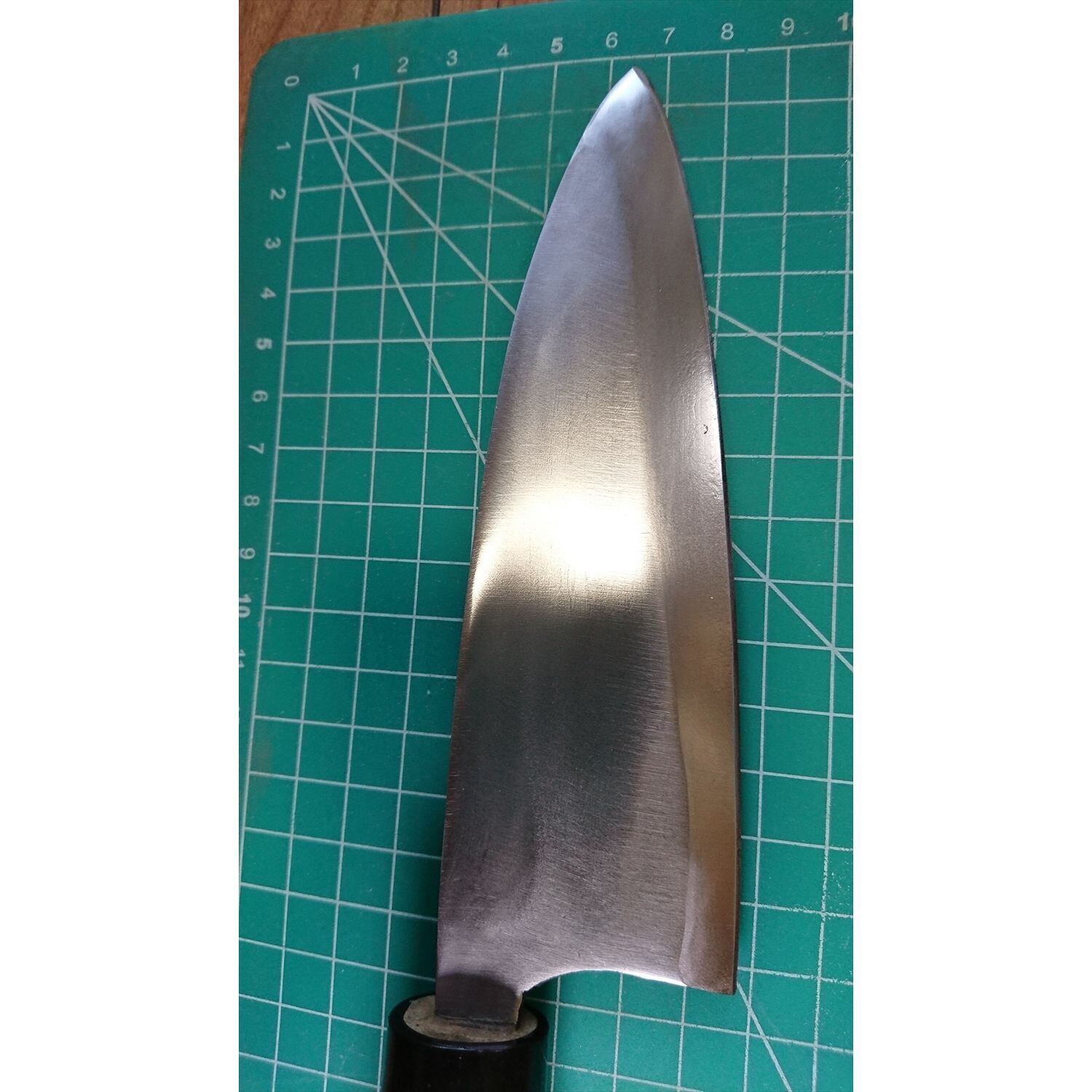 1. o2377/状態:中古/銘:銘?/出刃包丁(片刃 右利き用)/刃長:150/峰厚 アゴ上:7.9/重量:193/作り:鋼 元 黒打/他:柄は当社にて新品と交換済み