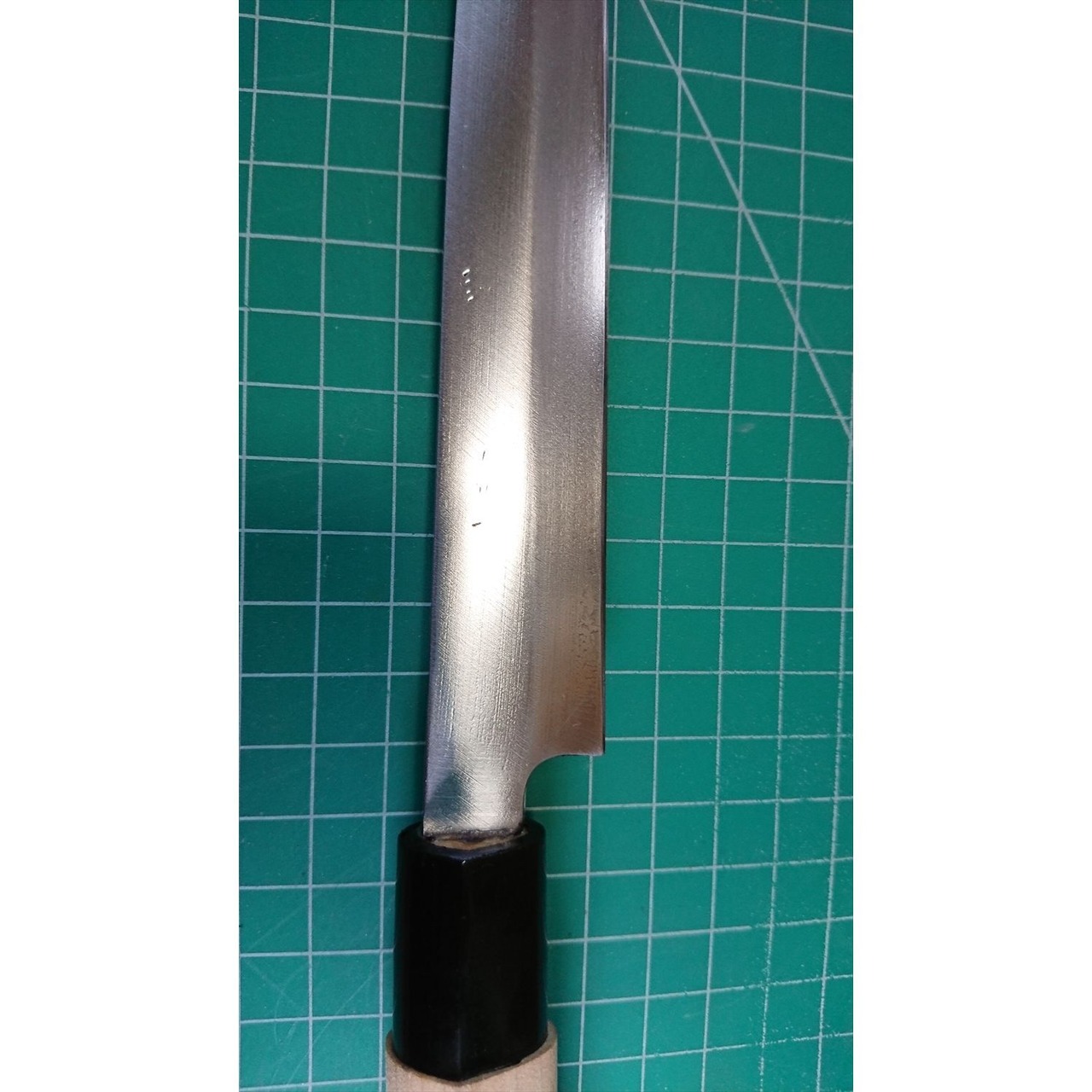 1. o2547/状態:中古/銘:銘?/刺身包丁(片刃 右利き用)/刃長:220/峰厚 アゴ上:3.7/重量:105/作り:鋼/他:柄は当社にて新品と交換済み